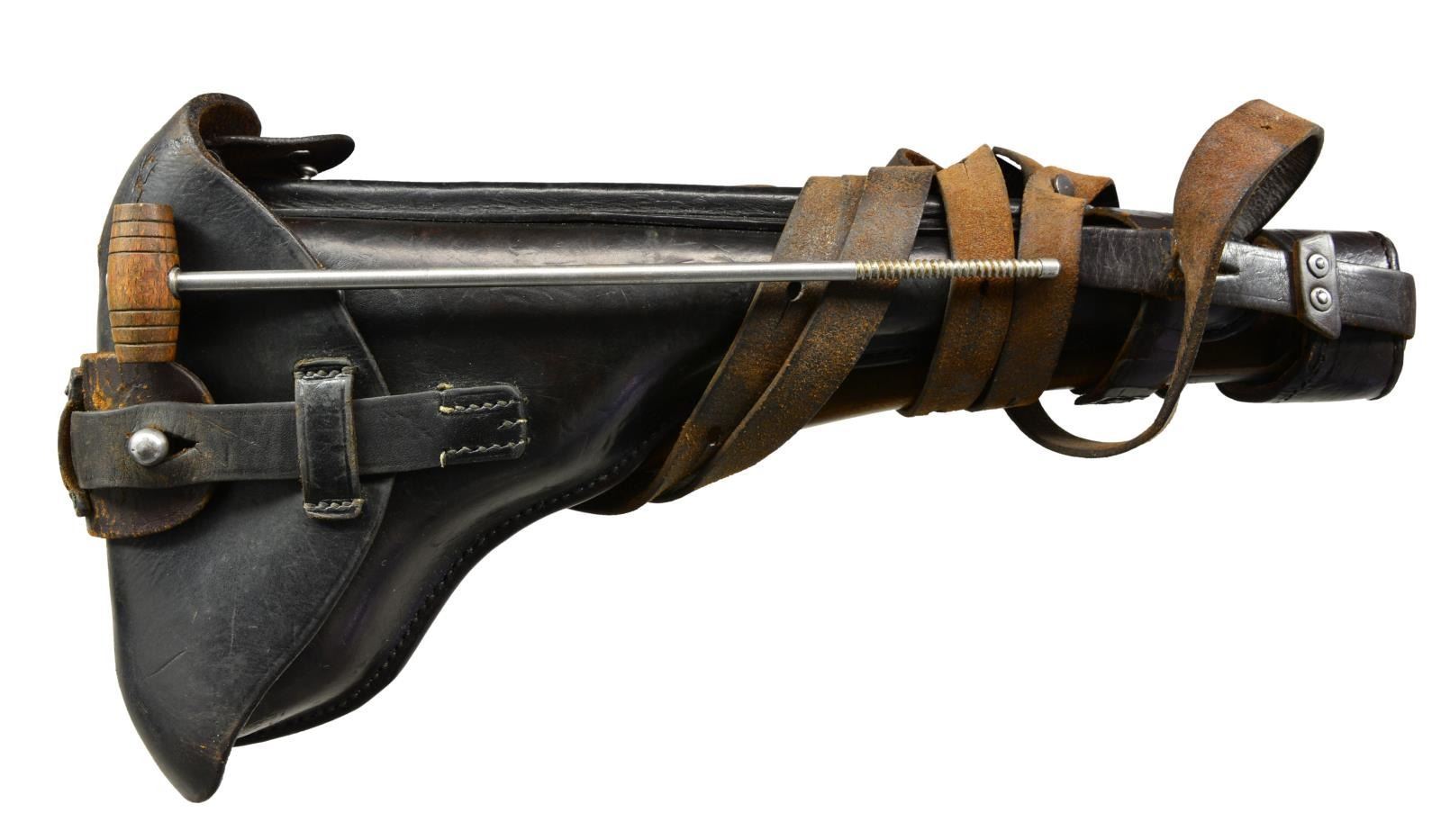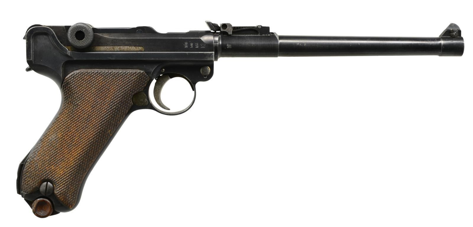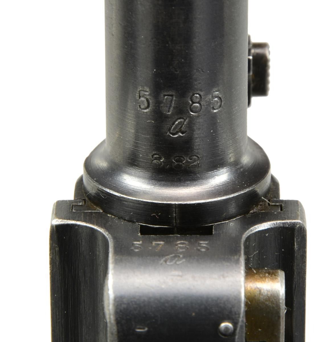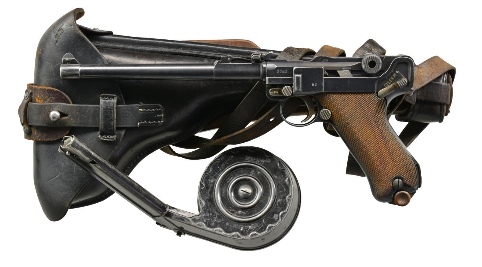 Cal. 9mm Luger. S# 5785a. Bbl. 8". Chamber dated 1917. Matching numbers throughout including grips w/ left additionally marked "F" & right w/ "V". Toggle pivot unnumbered. Fine tune sights also matching numbered components including front sight blade. Correct proofs. Strawed sm. parts & appropriate internal areas in the white. MAGS: 1 fair to good stained appearing tin plated 8 rd. cleaned of light oxidation. Wood base numbered "9538d +". UNATTACHED ACCESSORIES: matching numbered, great looking & conditioned stock / holster far superior to most examples. Very little signs of wear such as scratches on board back opposite holster. Holster dyed black & supple; brown under flap. Leather around end of stock & holster is dark brown. Strap around holster & stock w/ stud is added repair to original. Shoulder strap uniquely intertwined through stock, has slight cracking & medium brown appearance; dated 1915. Medium brown strap w/ stud from to over holster top, somewhat cracked w/ aged original appearance. Back of holster unmarked. Very good ears on flap covering cleaning rod handle. Near excellent cleaning rod. Loading tool w/ crown proof. B/N 32 rd. snail drum w/ reinforcing rings & stamped winder; both halves matching numbered. Very good appearance w/ black enamel finish & crown S proof. Strong spring tension. Scattered light pitting on bottom of drum. Balance w/ occasional spots of peppery to light oxidation only. Portion inserted into pistol very good w/ light rub marks; no spacer or cover. B/N loading tool w/ crown D proof & "m". Even patina finish throughout w/ hint of finish in protected areas. Smooth functioning. CONDITION: very good overall appearance w/ minimal high point wear such as front of frame, sideplate & muzzle. Good straw colors w/ occasional faint staining most noticeable on safety lever. Very good grips w/ occasional diamond top damage & slight wear; left best appearing. Very good to excellent bore w/ hint of frosting in grooves & ever so slight wear. Very slight pinprick oxidation on backstrap. All markings especially clear & appearance of original finish. A great example of Artillery Model. (20-1554/NW). CURIO. $4,000-6,000.