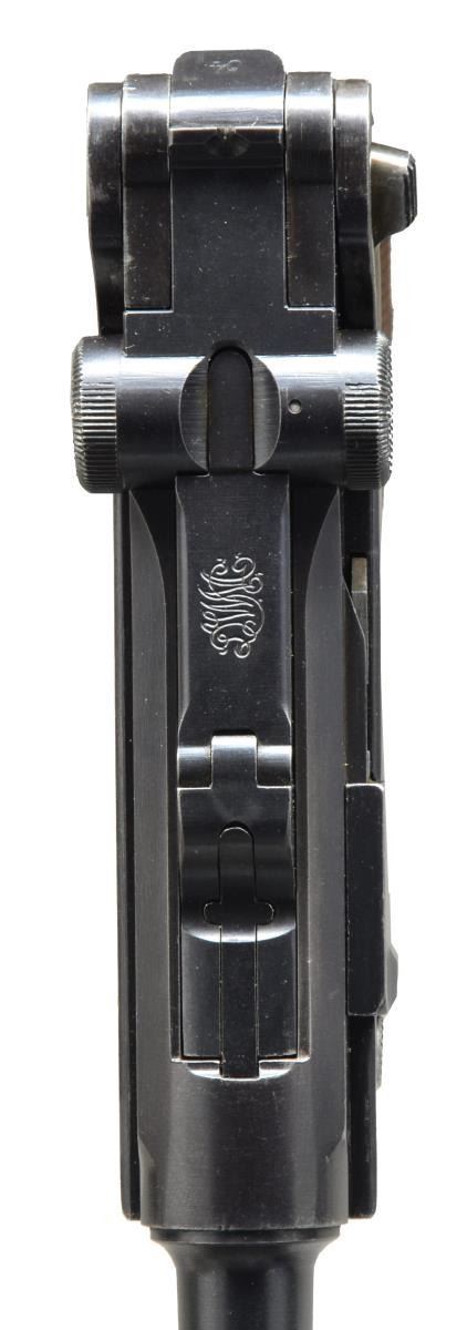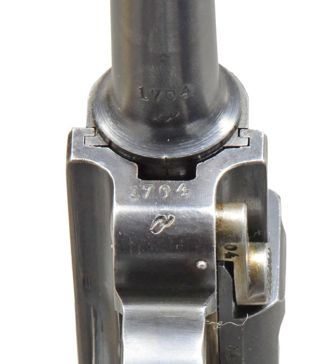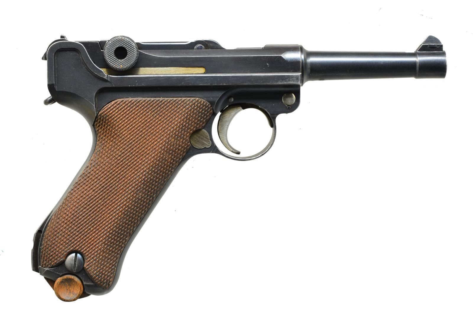 Cal. 30 Luger. S# 1704o. Bbl. 3 13/16". Crown N proofs plus “GERMANY” export marked on left front of receiver. Bbl., takedown lever, sideplate & rear toggle matching numbered; extractor numbered 79. Fin shaped front sight blade, strawed sm. parts & appropriate internal areas in the white. Checkered walnut grips & stock lug on back strap. MAGS: good plated 8 rd. w/ unmarked wood base. UNATTACHED ACCESSORIES: very good to excellent brown holster w/ strap & buckle retention. Noticeably squared mag. pouch; double belt loops; no mfg. marks. Bottom edge of flap w/ “GERMANY” export mark. CONDITION: very good overall appearance w/ light high point wear on sideplate & at muzzle. Very nice straw colors w/ fading & staining on safety lever. Very good to excellent well-fitting grips. Good to very good bore w/ light frosting. (20-4095/NW). CURIO. $900-1,400.