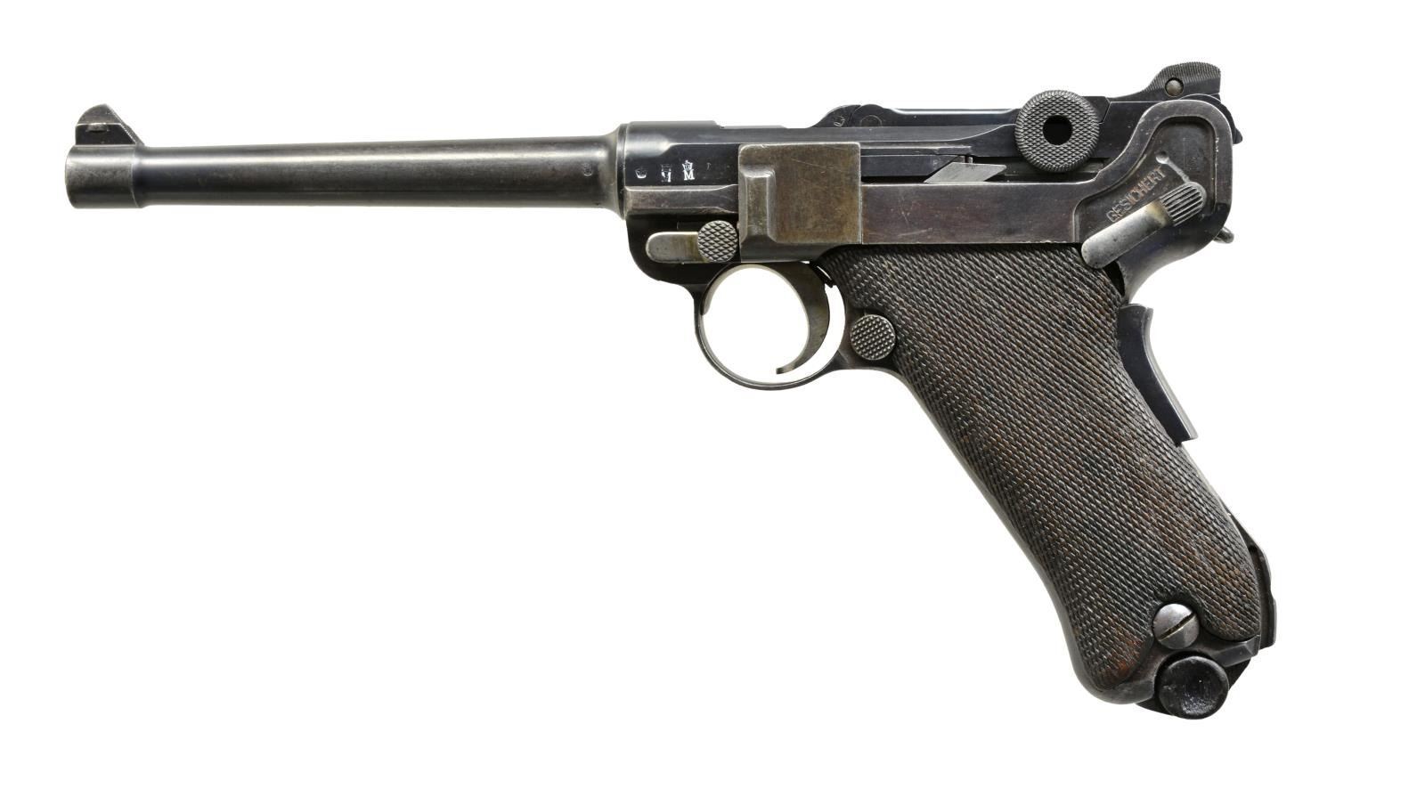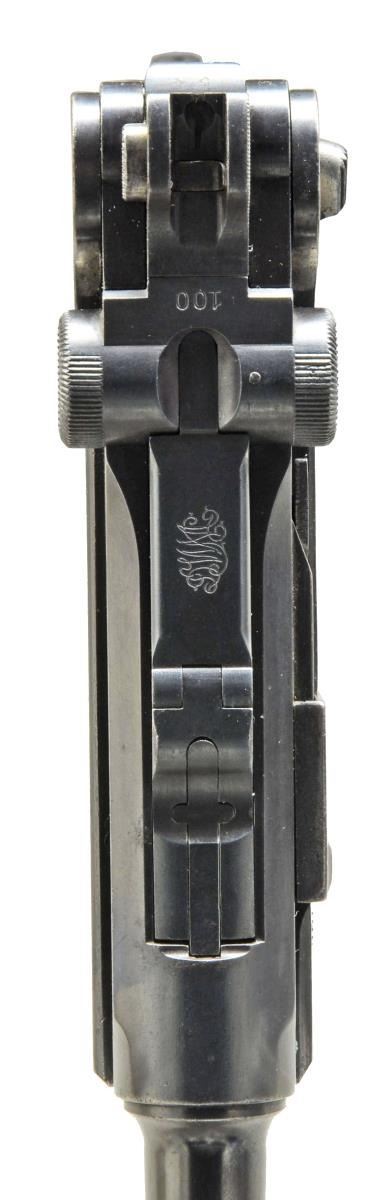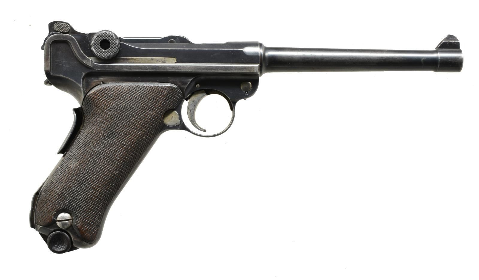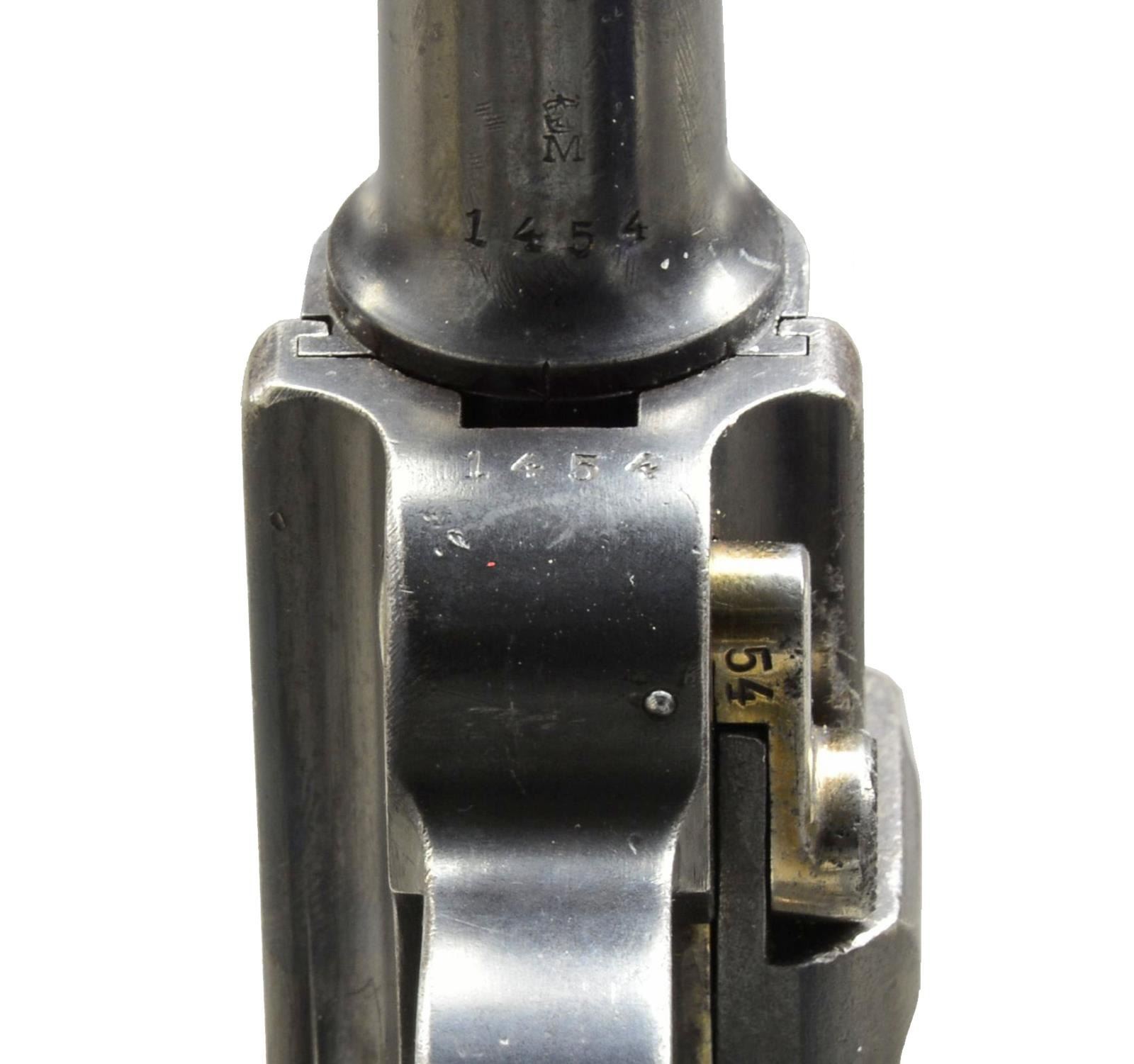 Cal. 9mm Luger. S# 1454. Bbl. 6” matching numbered w/ crown M proofs, correct partially serrated faced fin front sight blade & bottom of bbl. marked “GERMANY” (for commercial export) in slanted font letters. Receiver w/ appropriate Marine proofs & recoil lug numbered “54”. Matching numbered metal parts in proper commercial locations. Reworked first issue (20,000 units) w/ prior safety marking milled out of lower position & “GESICHERT” stamped in upper position; safe w/ lever down. After rework, pistol had same configuration of improved second issue that was numbered 1b-1000b; first issue numbered 1-9999. Strawed sm. parts & appropriate internal areas in the white. Back strap marked below grip safety w/ ” W W” over “193”; pistol #193 of Dockyard at Wilhelmshaven. Checkered walnut grips each numbered “8”. MAGS: non naval, fair stained appearing 8 rd. w/ wood base (chip at front of left dimple0) numbered “8392” & “+”. CONDITION: good to very good appearance w/ slight patina appearance to bbl., grip area & side plate. Light pitting to sides of frame under grips. Faded straw colors w/ some very light occasional pitting. Occasional faint pitting on right side of frame below rail. Light high point holster wear & faint, very light pitting on left side of bbl. at muzzle. Generally good grips w/ chip at safety lever on left & hand wear; more on right. Fair to good bore w/ even light to moderate pitting in grooves. (20-3185/NW). CURIO. $5,000-7,000.