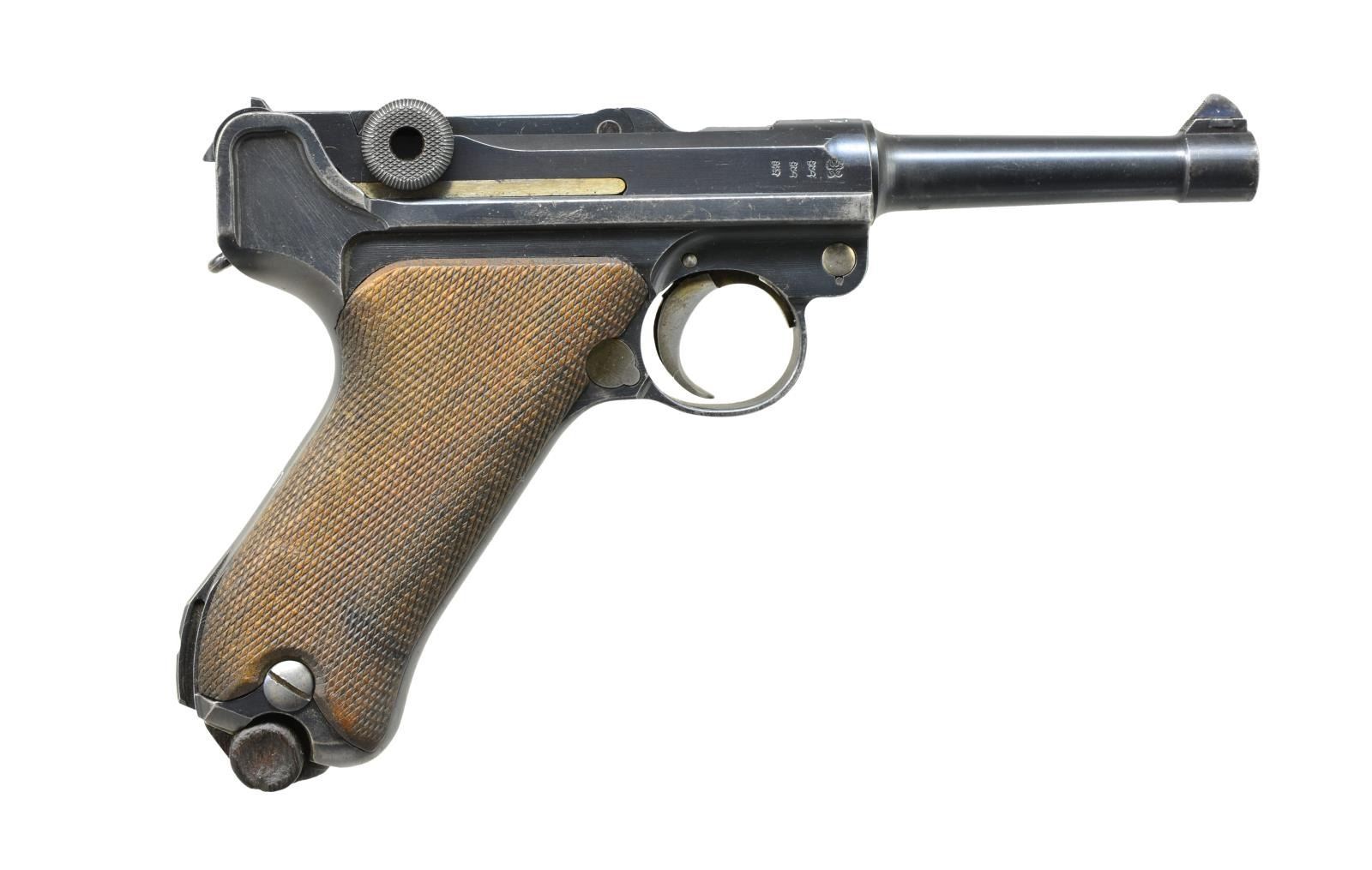 Cal. 9mm Luger. S# 3938. Bbl. 4". Mfg. 1917 as Model 1914 Military & Navy reworked in 1920; no sear or mag. safety nor provision for either. Original model mfg. 1917; 90,000 units w/ S# 211 to 3575n. Backstrap marked w/ "M" over anchor symbol over "N870" (Nordsee pistol #870). Receiver has proof marks of original reworked pistol. Blued w/ strawed small parts plus appropriate internal areas in the white. 1920 over 1917 on chamber area w/ 9 of 1920 being double struck; 1920 also on back of frame above lanyard loop. Sm. parts have matching numbers (including rear toggle pivot) except replacement gas grooved firing pin w/crown letter proof; no S#. Checkered walnut gips w/ 38 on back of left; right is blank. MAGS: good tin plated 8 rd. w/ wood base in only fair condition having sm. chip at dimple plus light gouges by unreadable remainder of S# (definitely not matching). UNATTACHED ACCESSORIES: fair black Navy marked (M over anchor) holster w/ 1915 date. Considerable restiching & replacement mismatched belt loops. Folded over tab of lift strap separated at its joining rivet. Flap retained by strap through loop to stud on top; damaged stiching at hinge. Loading tool pouch flap retained by brass snap rather than flap over stud. Back has "S" in triangle plus mostly visible writing of: "VERTINIGTE FABRIKANTEN / ???MILITARLEDERZEUGE / G.M.B.H. / SOLIGEN". CONDITION: good to very good as refinished having clear markings. Light to moderate holster like high point wear. Very minimal function wear. Light hand wear to grips w/ fit to frame of right especially good. Very good bright bore w/ distint rifling & occasional faint light frosting. (20-3243/NW). CURIO. $3,000-4,500.