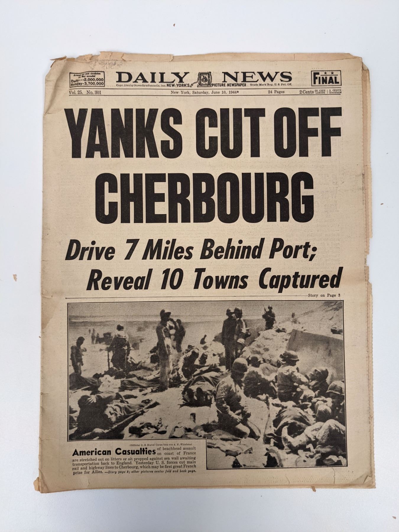 Daily News 1944 Vintage Newspaper. Jun 10 1944. Yanks Cut Off Cherbourg. 12x16 inches