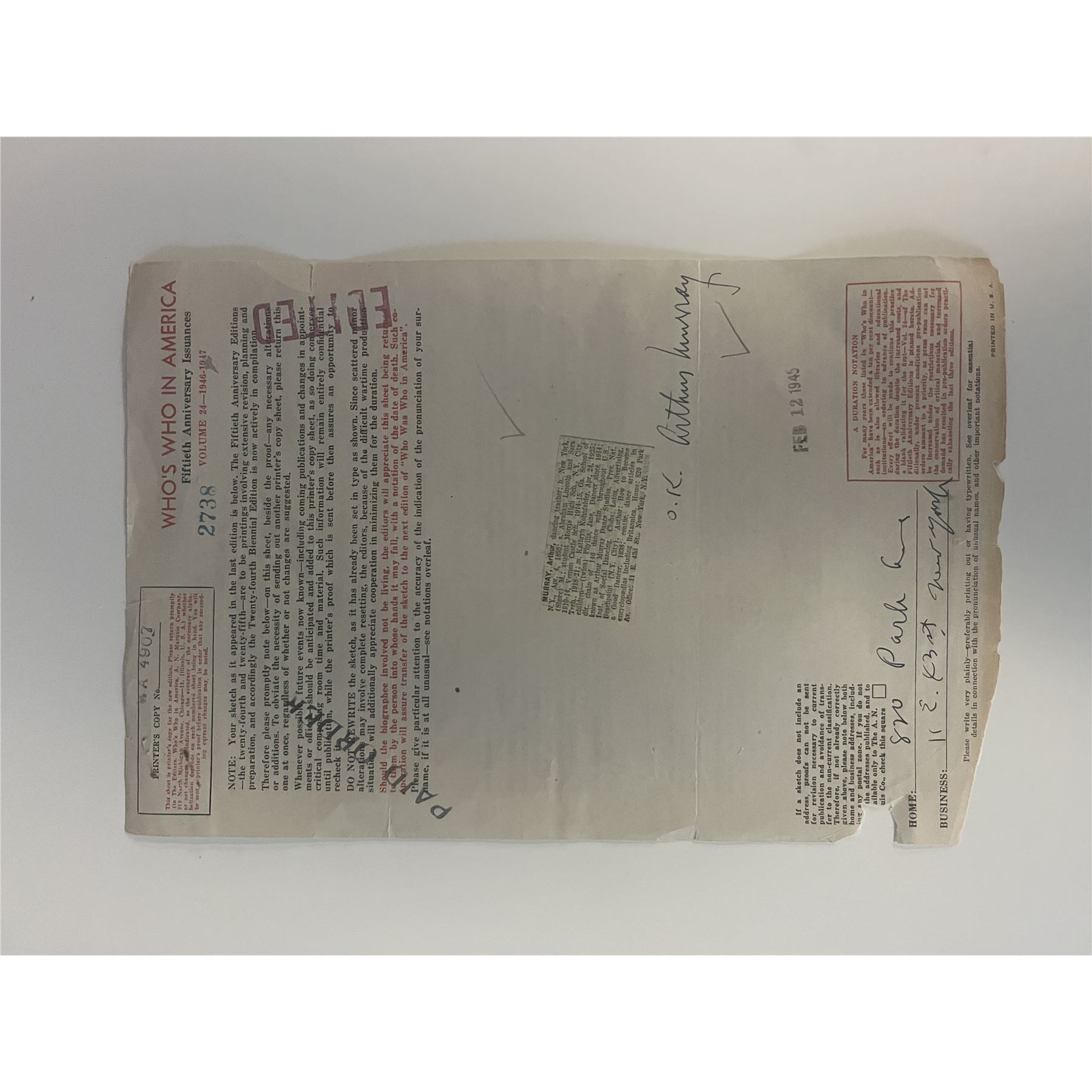 Dance Instructor Arthur Murray signed print.7x11 inches