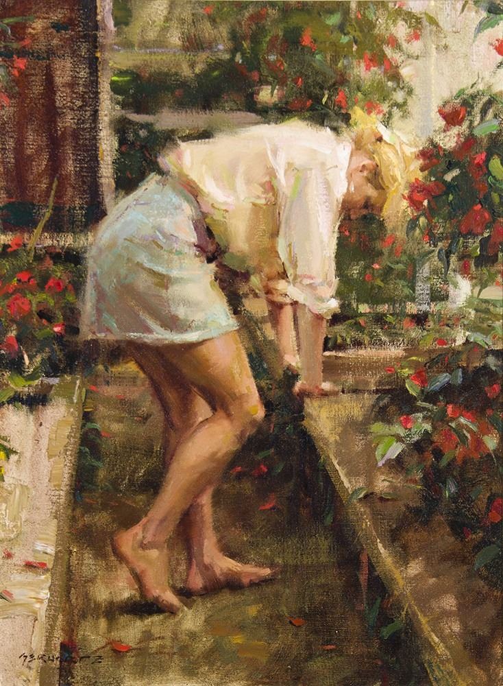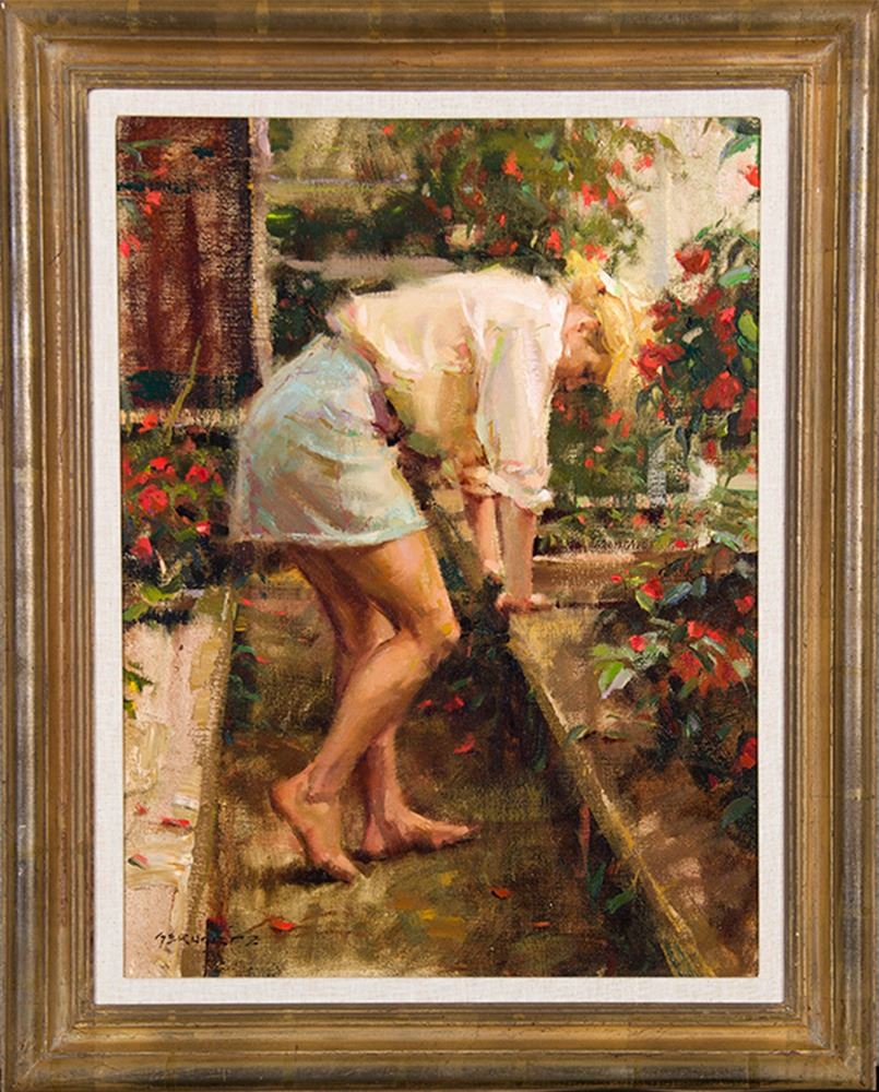 Artist: Daniel Gerhartz; Title: Greenhouse Designs; Medium: Oil on canvas; Dimensions: 24 x 18 inches; Signed: Signed lower left; Framed/Base: 30 x 24 inches