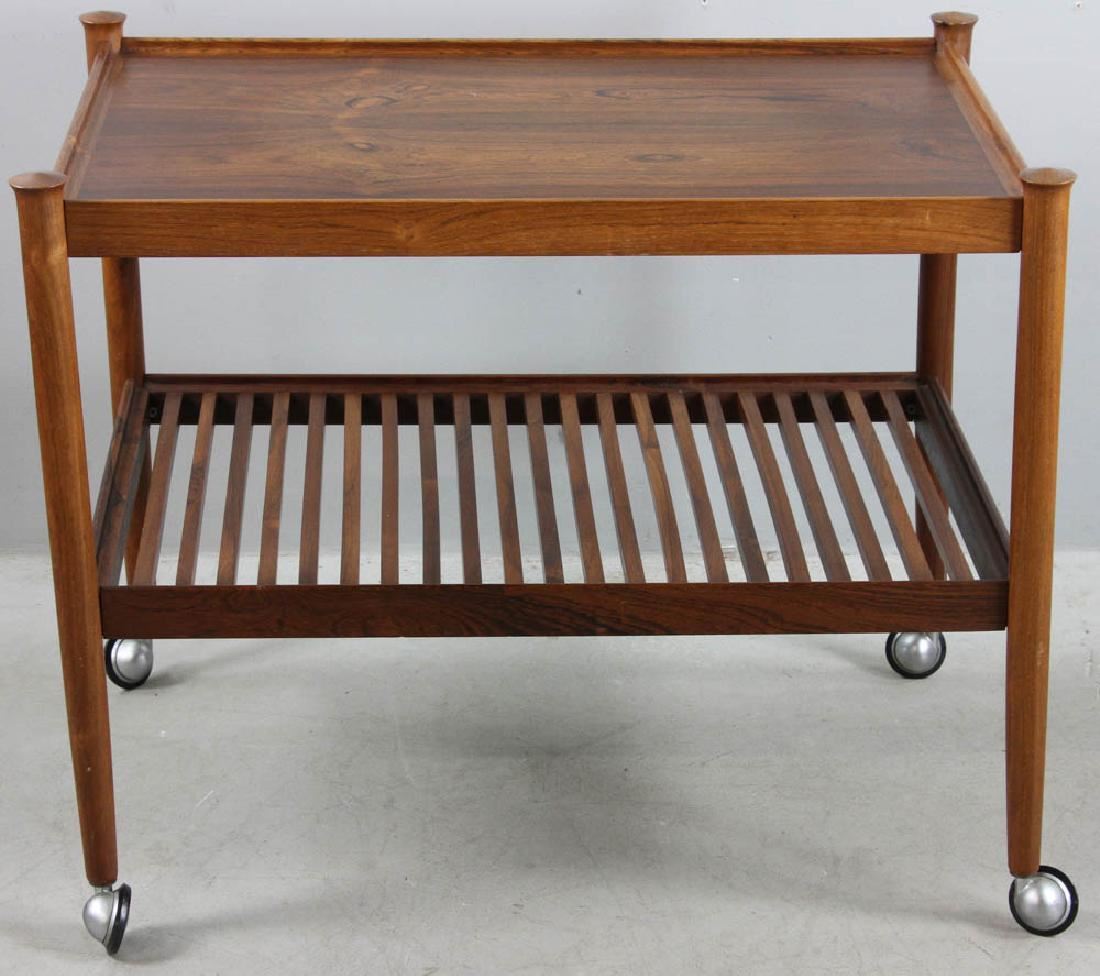 Danish rosewood and teakwood mid-century rolling tea/bar cart labeled,'Illums Bolighus Kobenhavn', 24" x 30" x 20". Provenance: Wenham, Massachusetts estate.