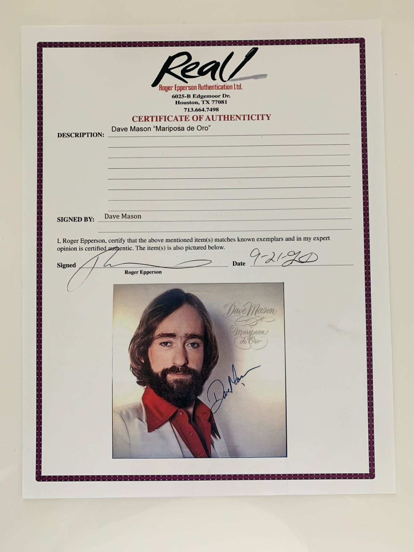 Dave Mason signed Mariposa de Oro album. Vinyl included