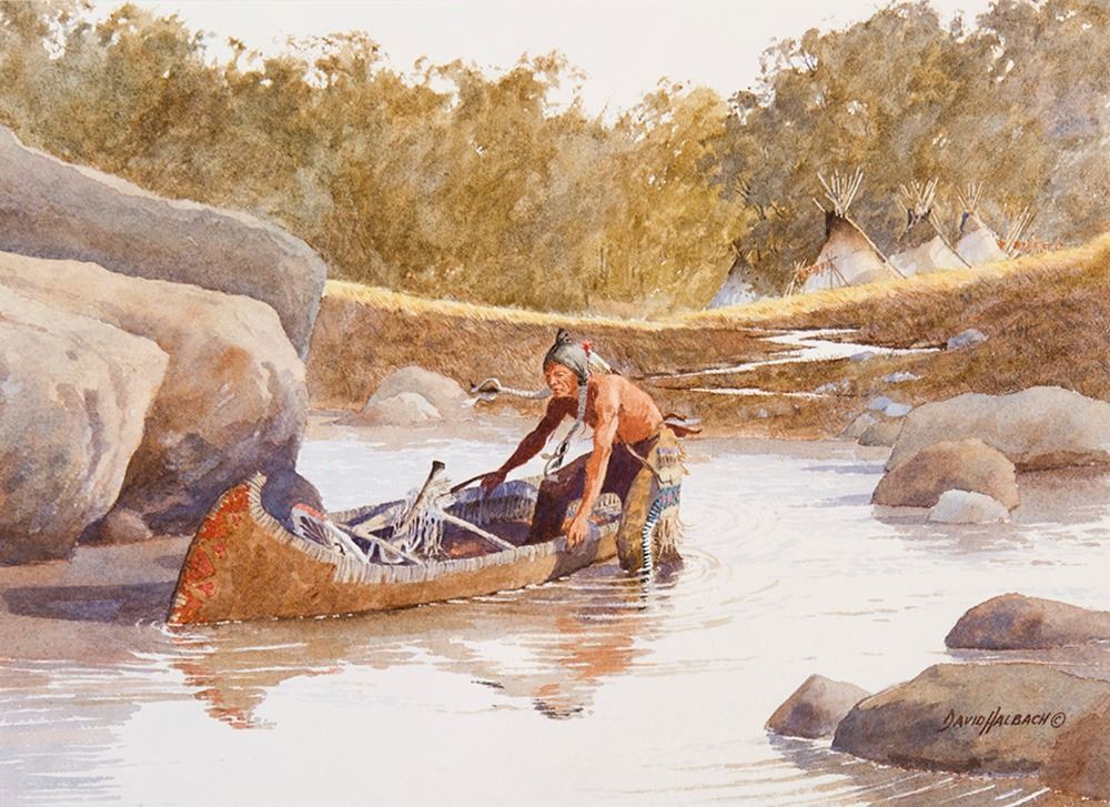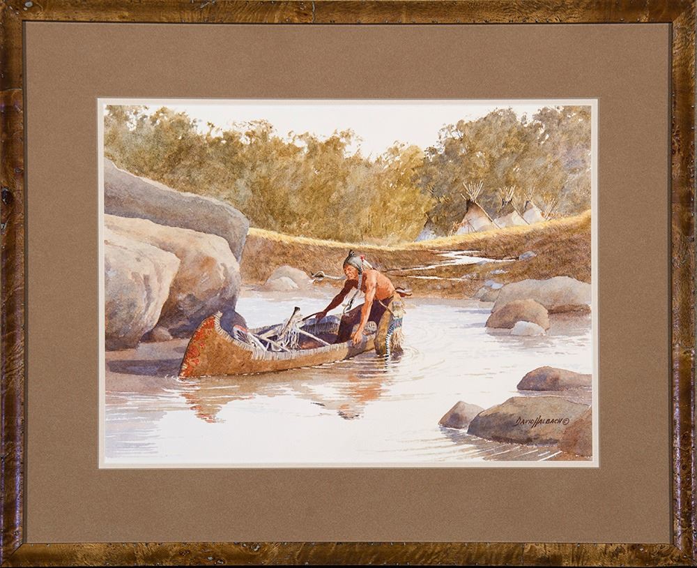 Artist: David Halbach; Title: Untitled (Indian in canoe); Medium: Watercolor on paper; Dimensions: 12 x 16 inches; Signed: Signed lower right; Framed/Base: 19 x 23 inches