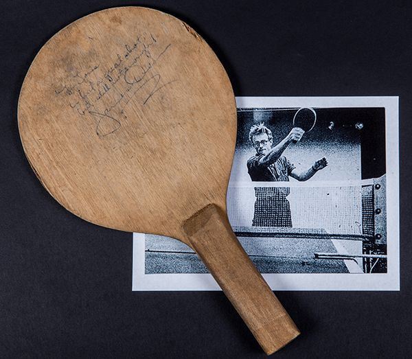 Dean, James. Ping-pong paddle signed and inscribed, "To Janis What a great shot, but still not enough! James Dean," no place, no date (early 1950s). Written with a fountain pen in blue ink to a woman with whom he had played table tennis. Accompanied by a print of a photo of Dean playing ping pong. James Dean (1931-1955) was an icon of teenage disillusionment as portrayed in his roles as troubled teenager Jim Stark in Rebel Without a Cause, loner Cal Trask in East of Eden (1955), and the surly ranch hand, Jett Rink, in Giant (1956). Dean was the first actor to receive a posthumous Academy Award nomination for Best Actor. He received two: the first for East of Eden, in 1955, and the second in 1956 for Giant in 1956. He died in a car crash on Sept. 30, 1955, which assured his legendary status.