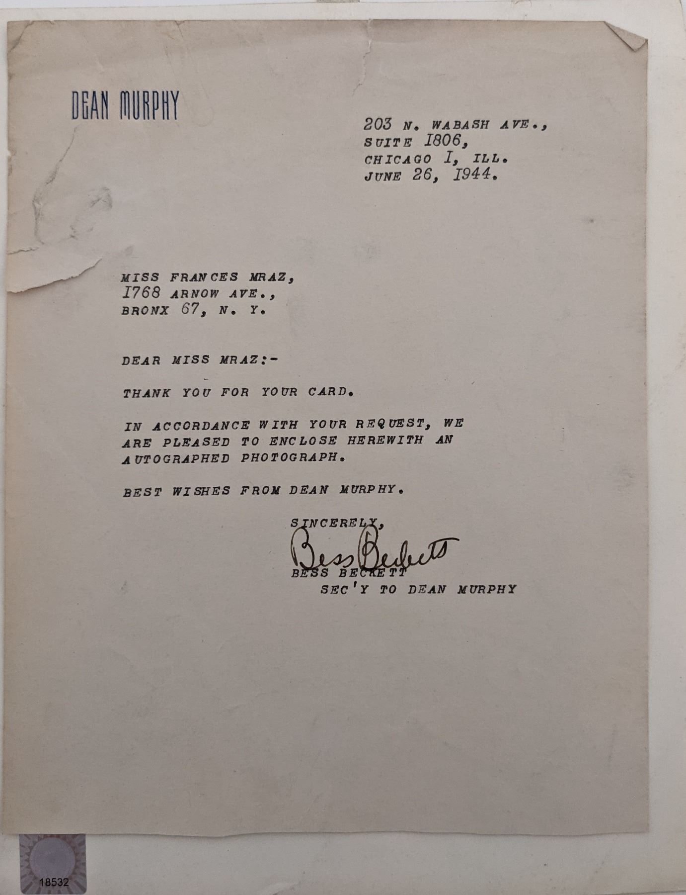 Dean Murphy Signed Photo and Letter - 8x10 inches