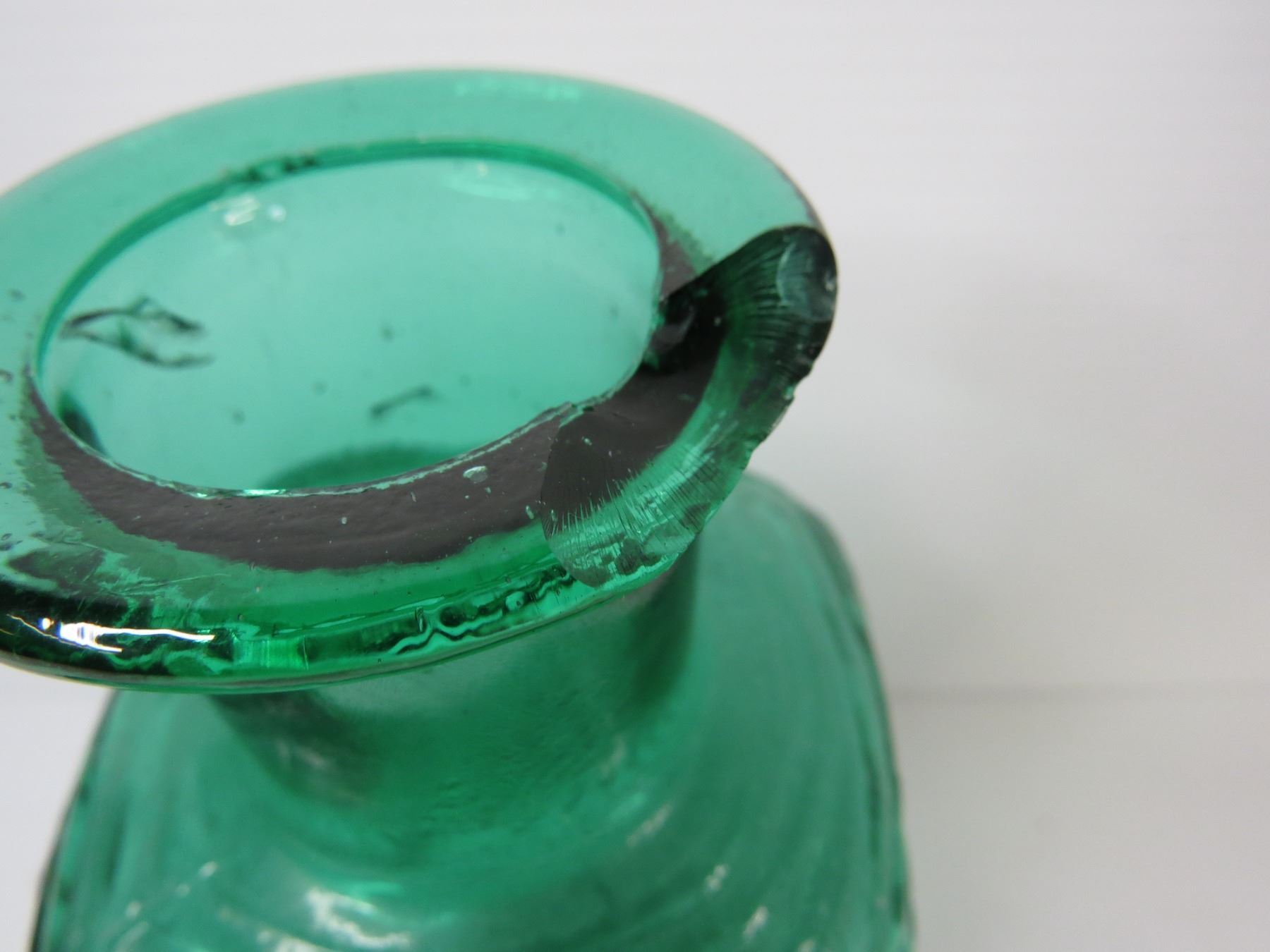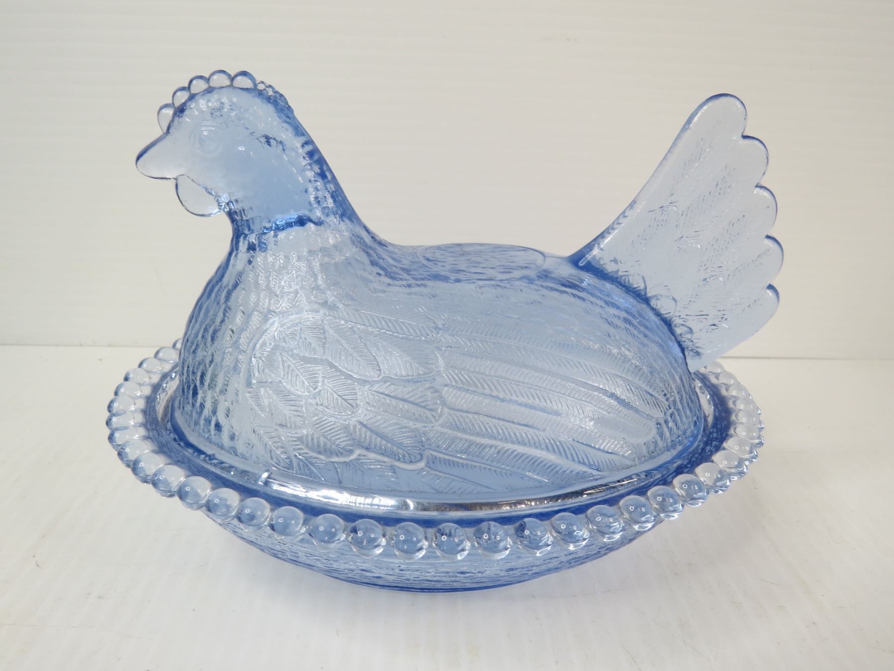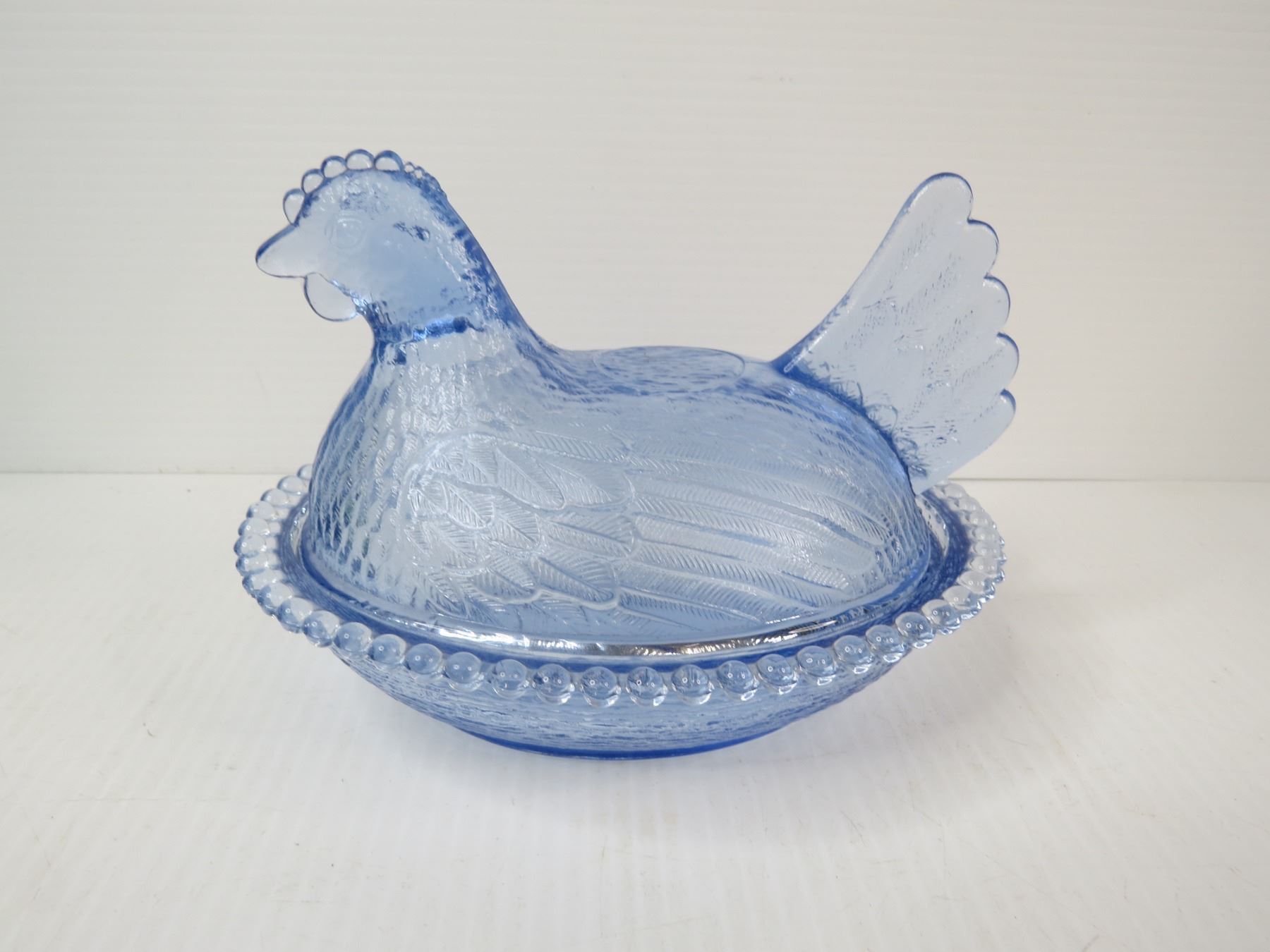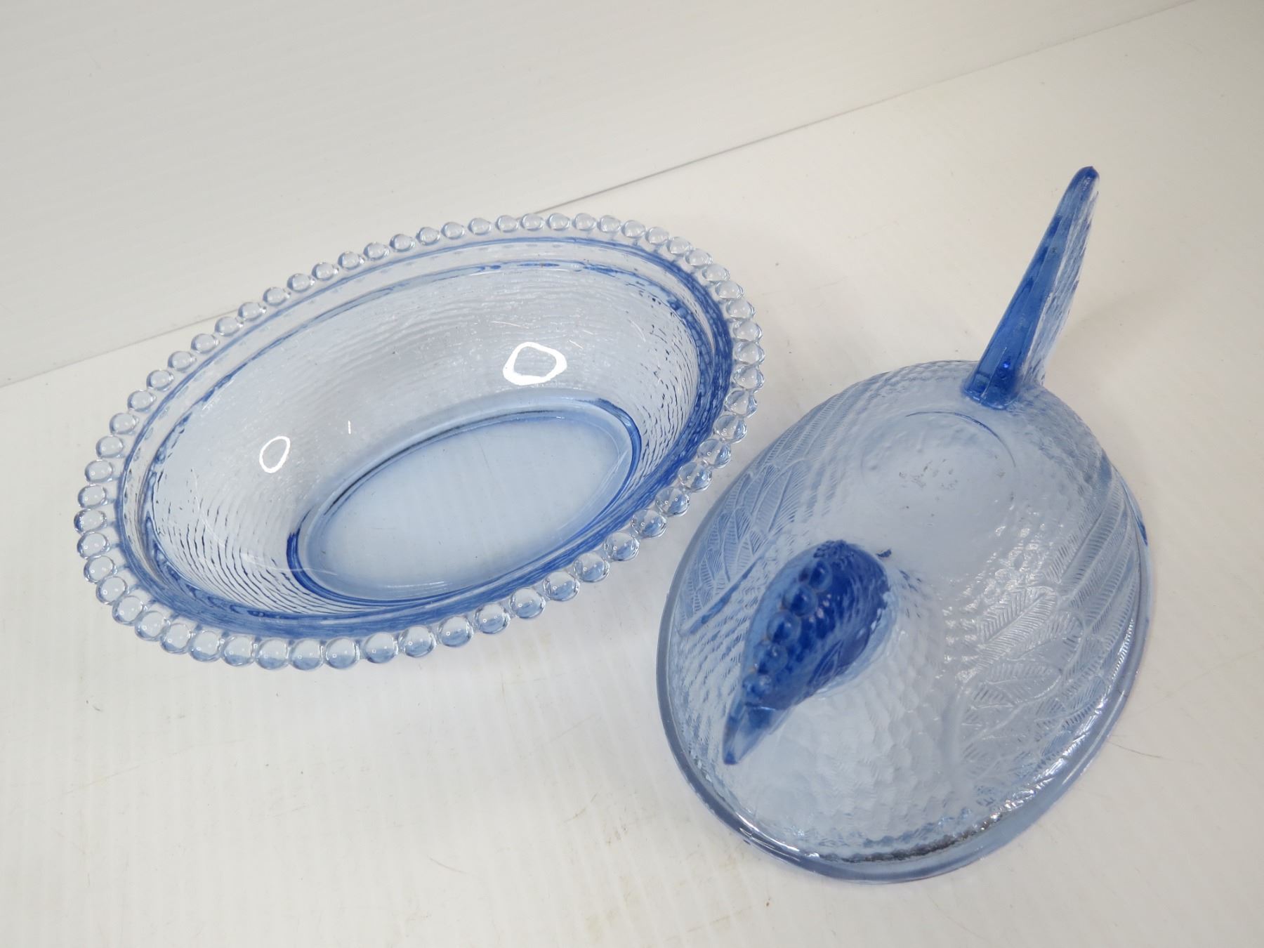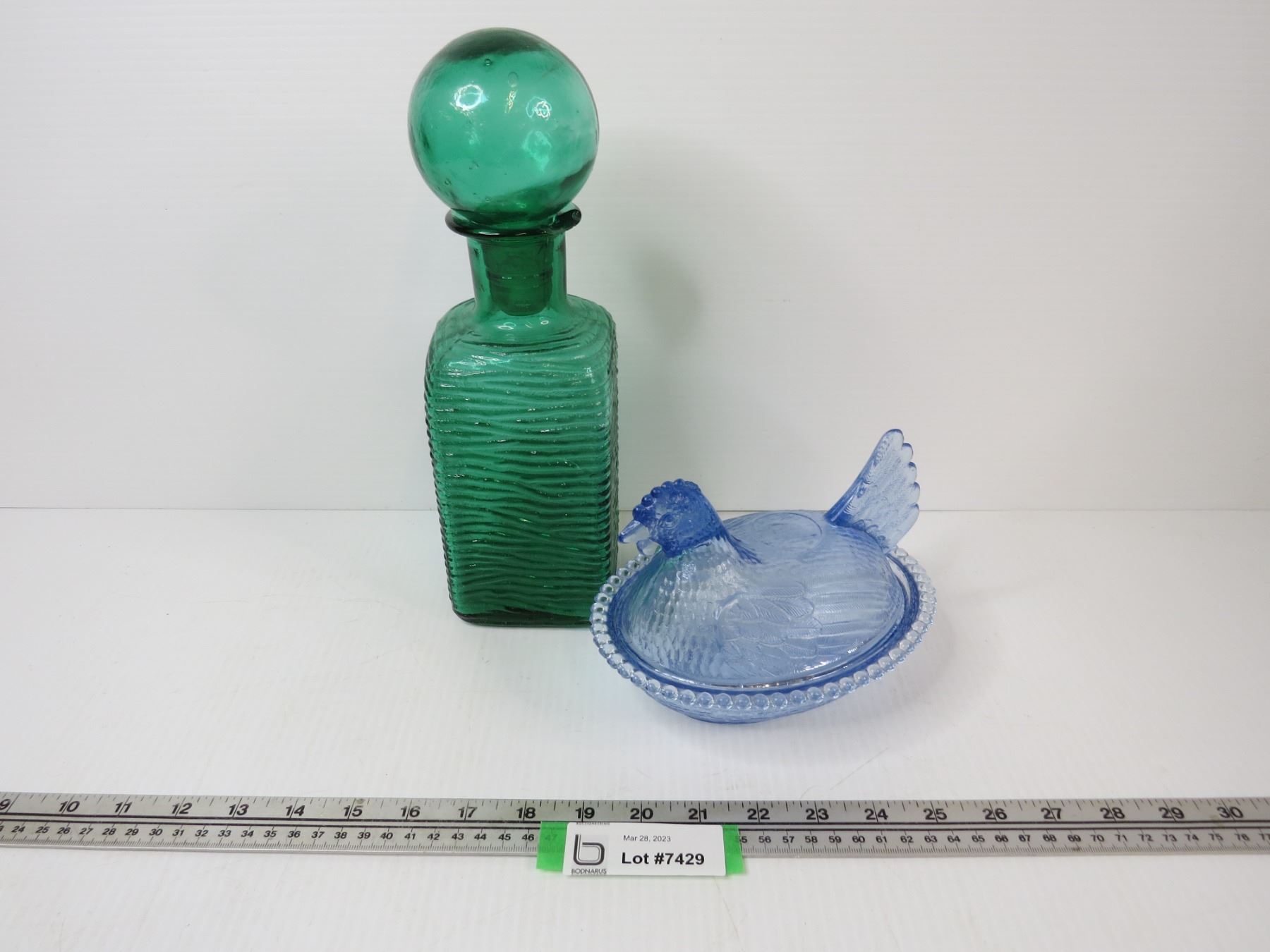 Decanter/Vase? (Lid does not belong to it - has chips - Blue Glass Hen on a Nest Dish (nice shape no chips)