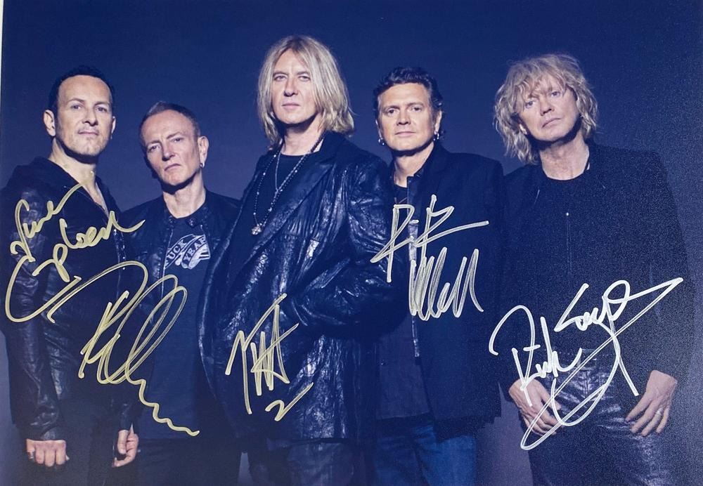 Def Leppard band facsimile signed photo autographed by Joe Elliott, Rick Savage, Rick Allen, Phil Collen, and Vivian Campbell. 8x10 inches. This item is a reprint of an original autograph