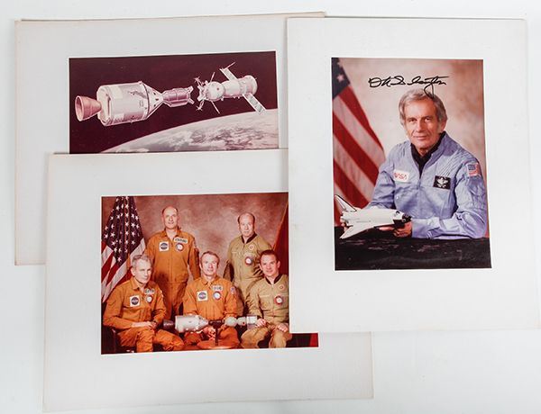 Deke Slayton Autograph on an Official Nasa Portrait From the Early Days of the Shuttle Program. Slayton is holding a shuttle model seated in front of an American flag. The photo (9.5 x 7") is mounted on a presentation mat (14 x 11")Boldly signed. Attractive. Also included are 2 other unsigned mounted photos. One is a photo of an illustration of the ASTP Apollo and Soyuz capsules about to dock. The other is an official ASTP crew photo. Ex. the Astronaut Donald K. "Deke" Estate Collection.