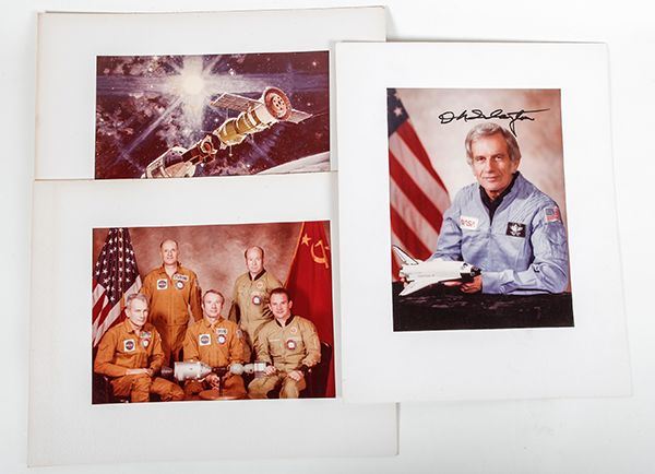 Deke Slayton Autograph on an Official Nasa Portrait From the Early Days of the Shuttle Program. Slayton is holding a shuttle model seated in front of an American flag. The photo (9.5 x 7") is mounted on a presentation mat (14 x 11") Boldly signed. Attractive. Also included are 2 other unsigned mounted photos. One is a photo of an illustration of the ASTP Apollo and Soyuz capsules about to dock. The other is an official ASTP crew photo. Ex. the Astronaut Donald K. "Deke" Estate Collection.