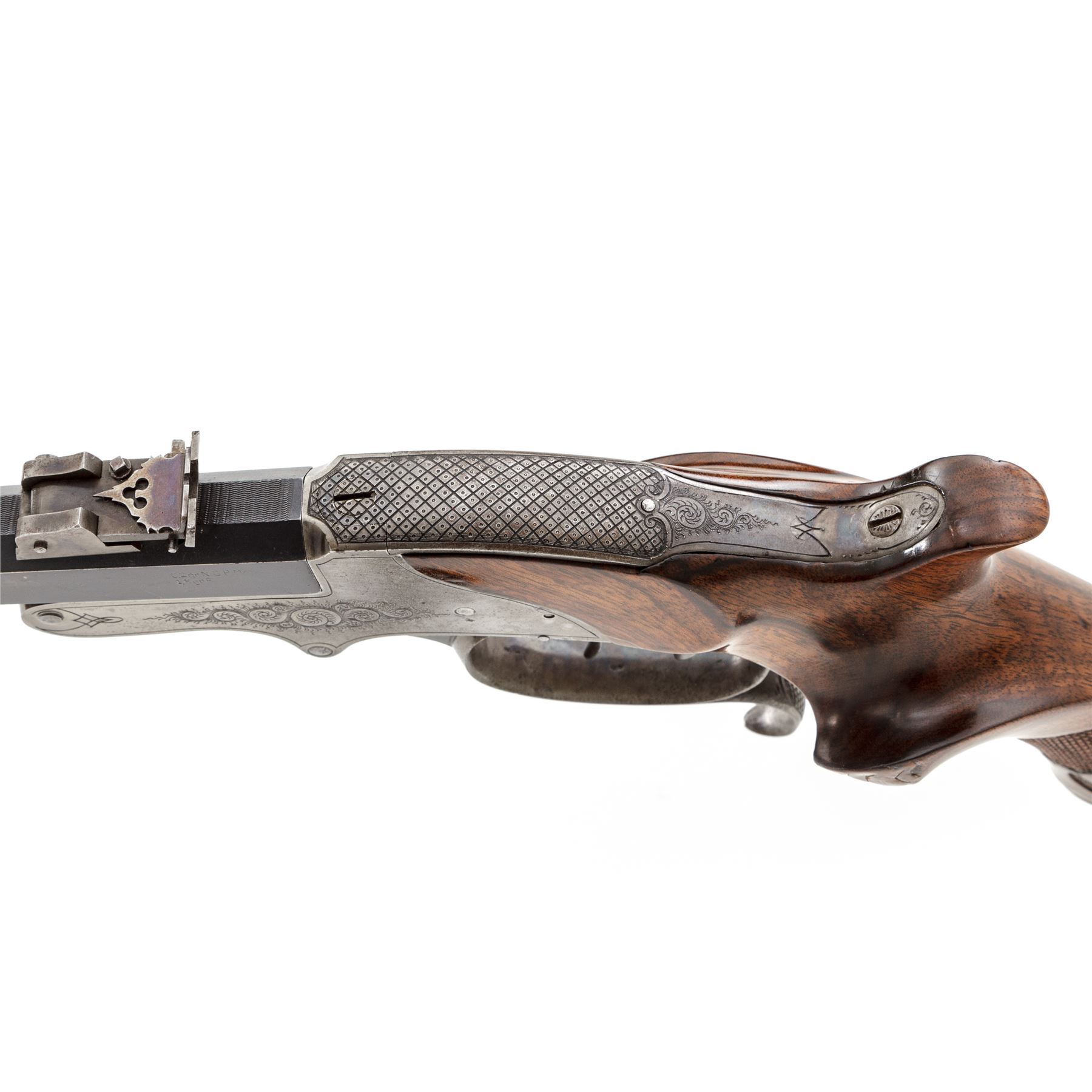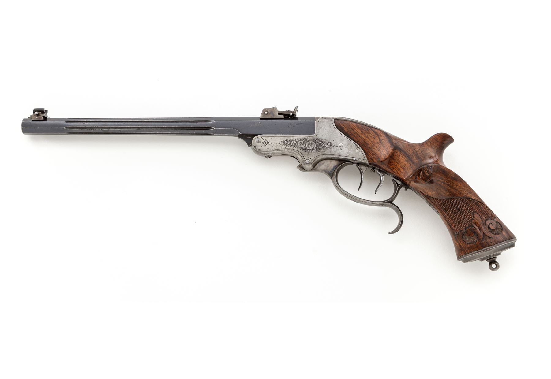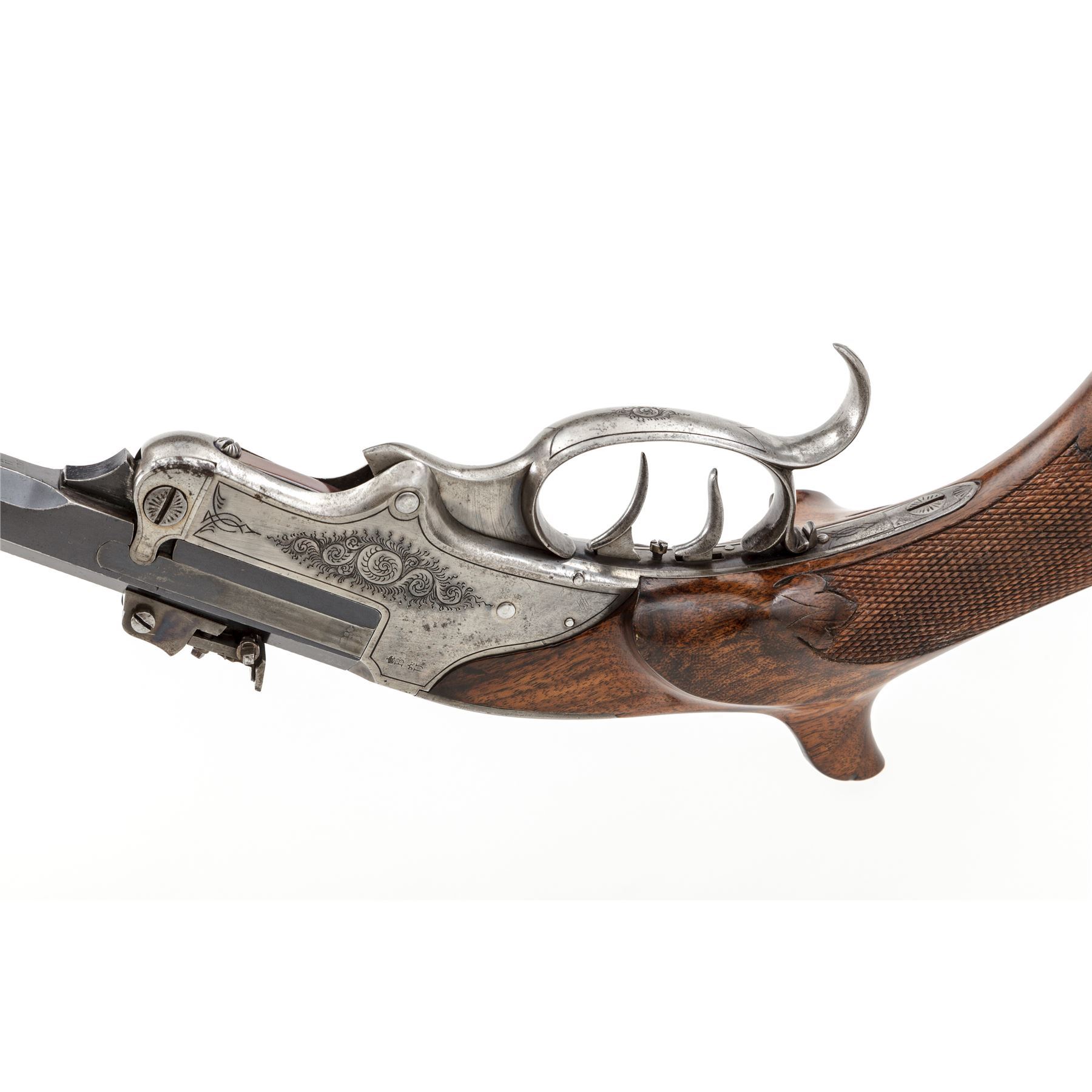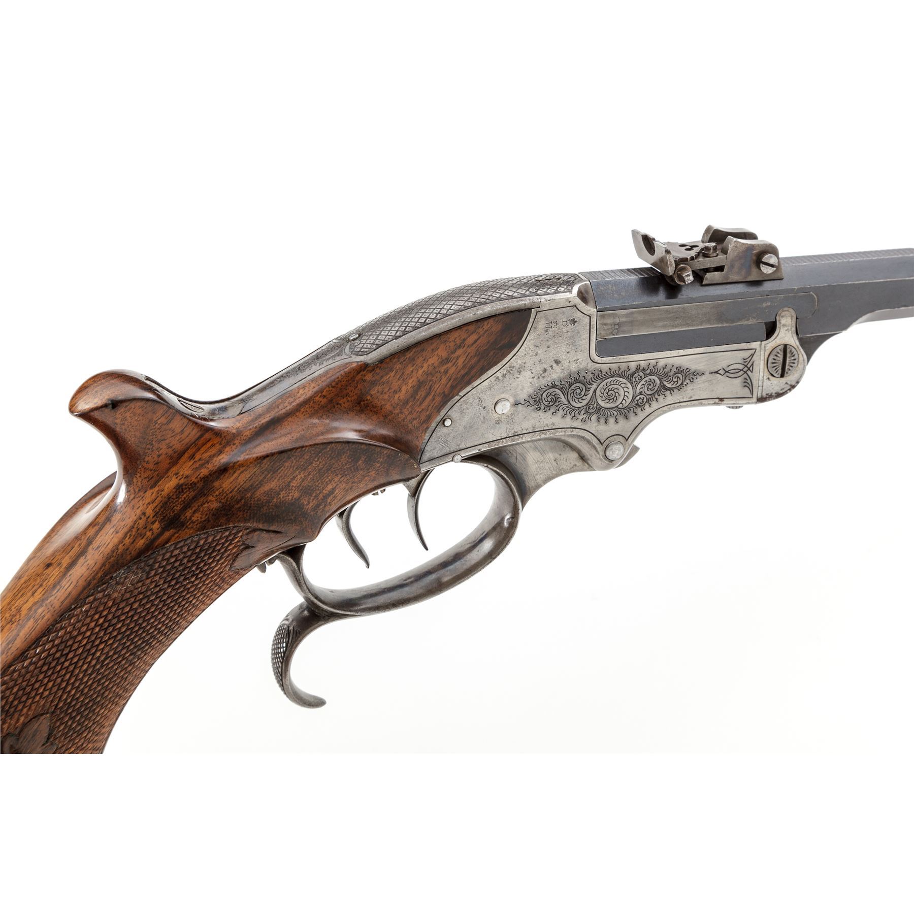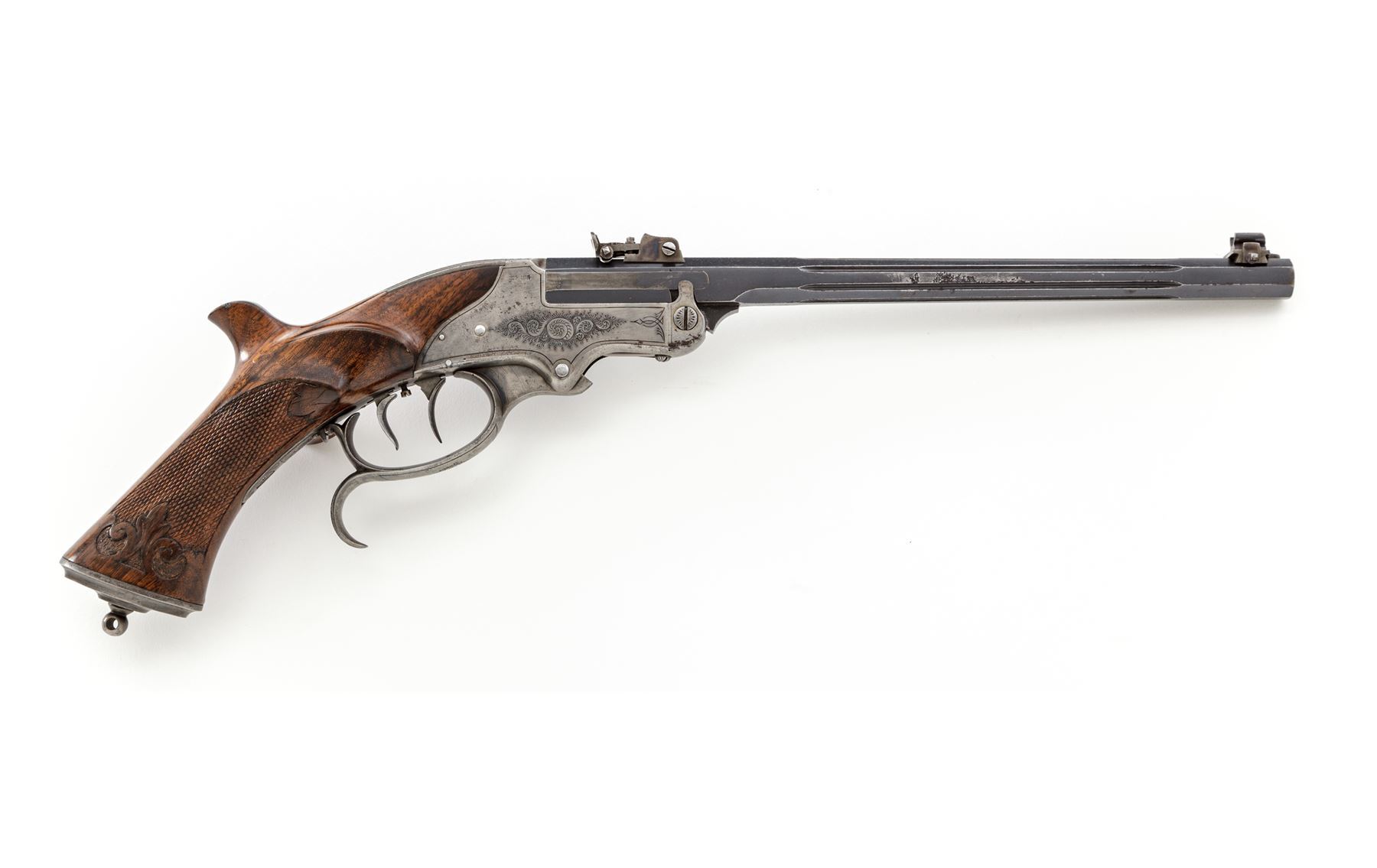 Deluxe Engraved and Carved Hammerless German Langenhan Olympic Target Pistol, #13094, .22 LR RF cal., blued 11'' fluted-octagonal barrel, with dovetailed adjustable target front and dovetailed adjustable leaf rear sights; full-length matted top rib is marked with cartridge specs at left breech and associated marks on bottom flat; case hardened steel receiver has delicate ''bank note'' engraving, engraved screw heads, a long engraved and matted top tang, double set triggers, and scrolled operating lever/triggerguard with rear finger-rest that drops to open the tip-up barrel for loading/automatic extraction/cleaning; varnished walnut buttstock has a carved and checkered grip with thumb and finger rests, and an engraved oval steel buttcap with lanyard stud. Condition is excellent: the barrel retains 85% blue with a 1.5'' area of pitting-roughness on right flat; the receiver, lever and buttcap with softly mottled case colors. Stock shows sharp checkering and carving and all of its varnish finish. Action is smooth and crisp; bore is dirty with defined rifling. In addition to this pistol's rarity, it is a work of art and a visual treat. Est.: $1,000-$1,500. (C& R)