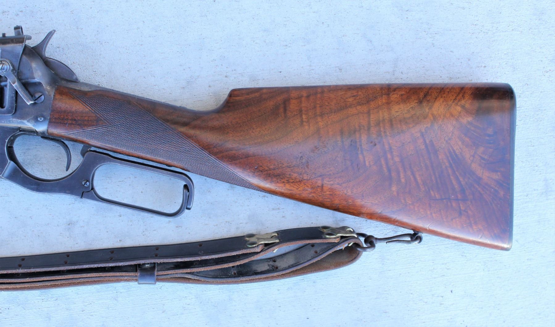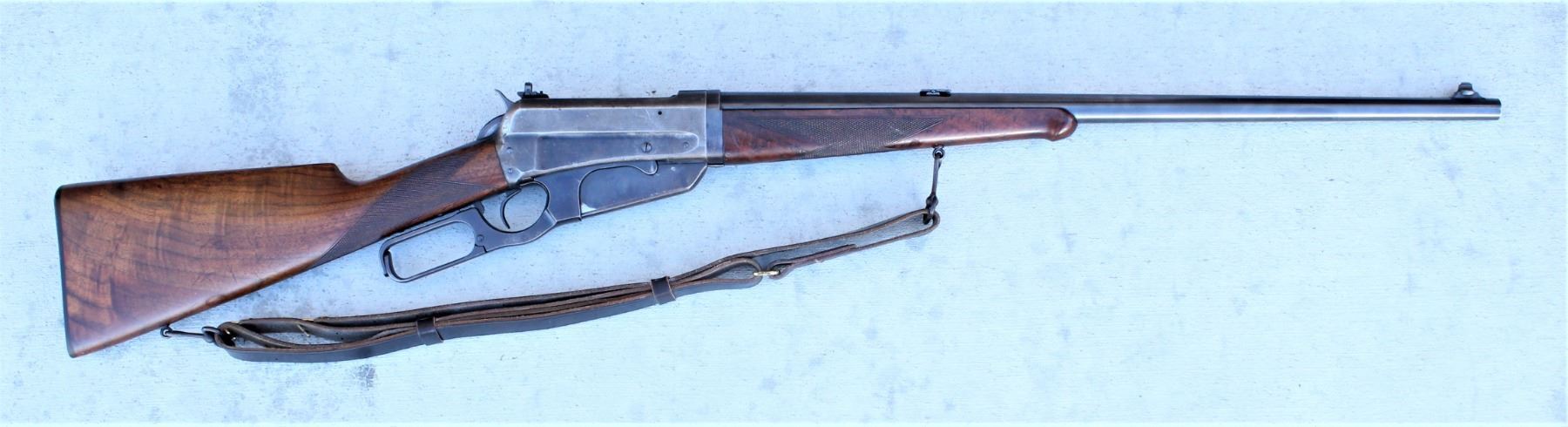 Serial #407149 Caliber 405 WCF Manufactured 1920. Made famous by Theodore Roosevelt, the .405 Winchester was his “Good Medicine For Lions”. This fine example is the Deluxe checkered pistol grip variation with takedown option and is fitted with Lyman sliding receiver sight and Winchester sling swivels and studs. The wood stocks are of highly figured American walnut and the forearm is checkered in the “H” pattern and the stock has a shotgun butt. The classic American big game lever action suitable for a President. Rifle remains in fine condition with period wear but elegant and serviceable. C&R