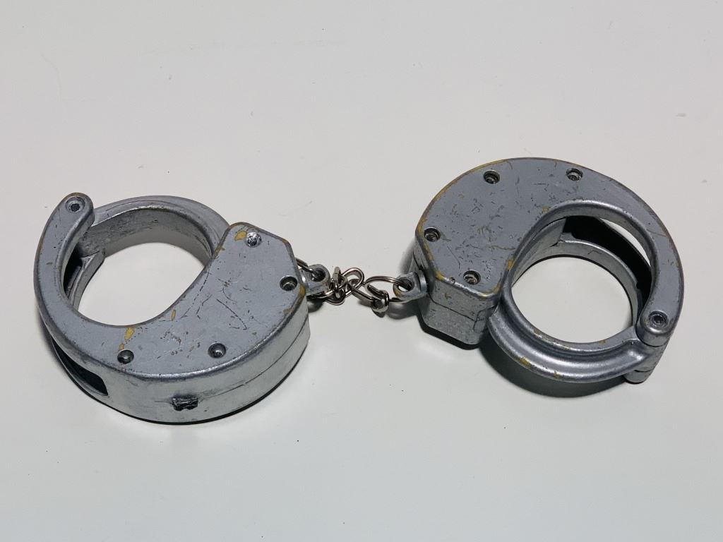 Original futuristic pair of handcuffs made for the science fiction action film 'Demolition Man' (1993), where Stallone is John Spartan, a risk-taking police officer, who has a reputation for causing destruction while carrying out his work.
