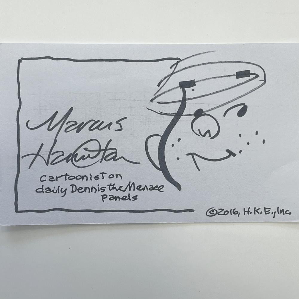 Dennis the Menace Cartoonist Marcus Hamilton original signature with hand drawn sketch. 5x3 inches