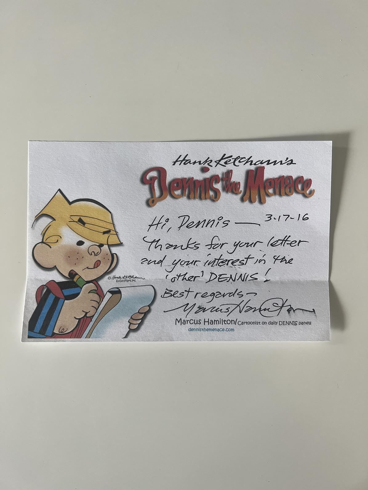 Dennis the Menace creator Hank Ketcham signed note on cartoon stationary.6x4 inches