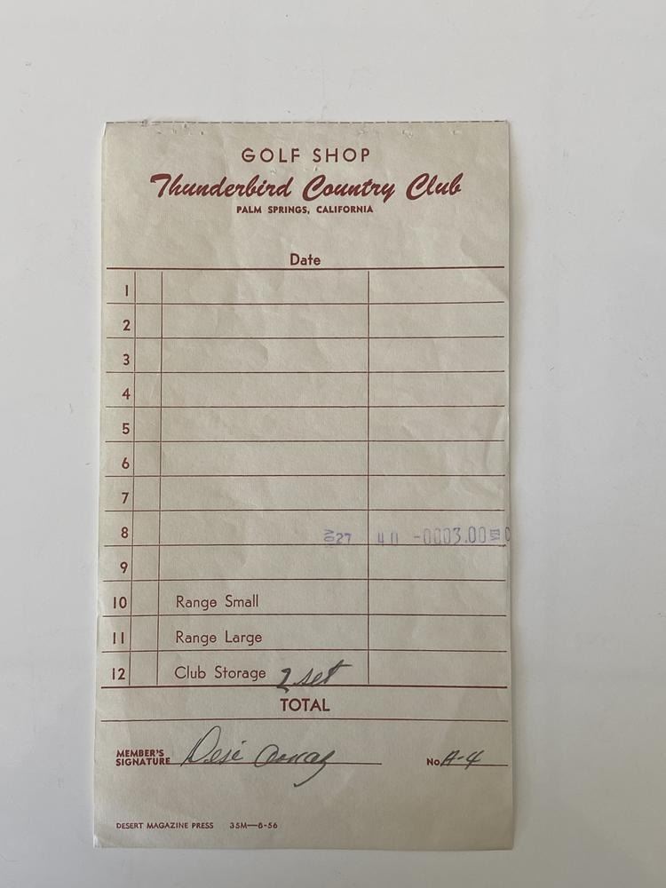 Desi Arnaz signed Thunderbird Country Club Golf Shop invoice. 5x7 inches