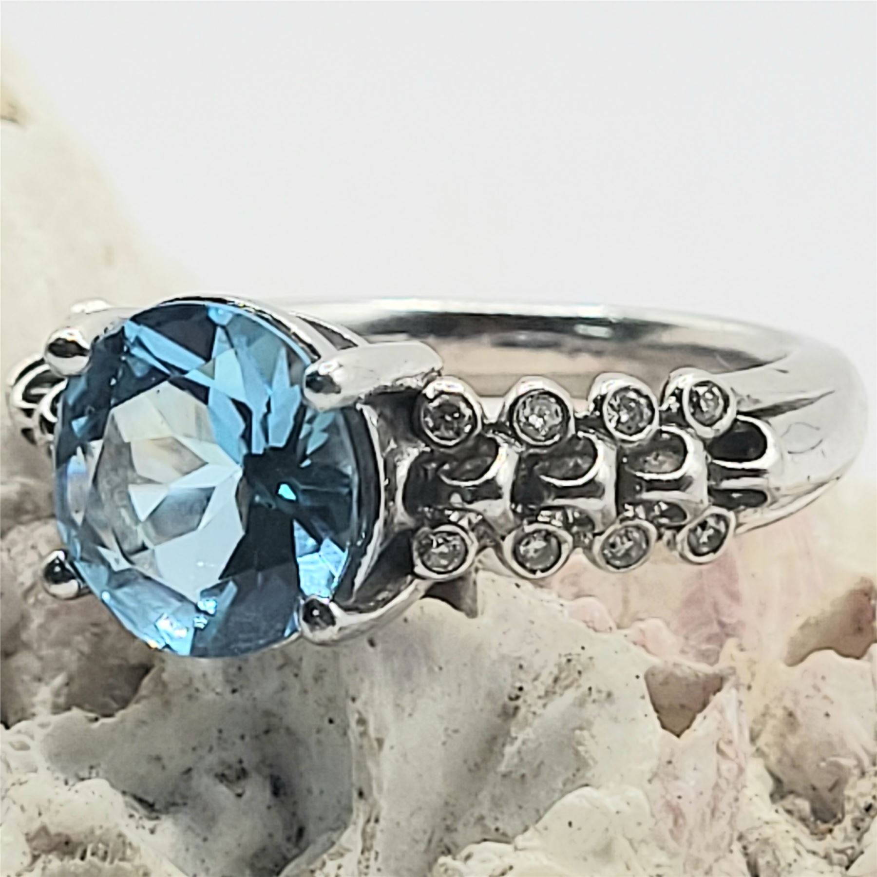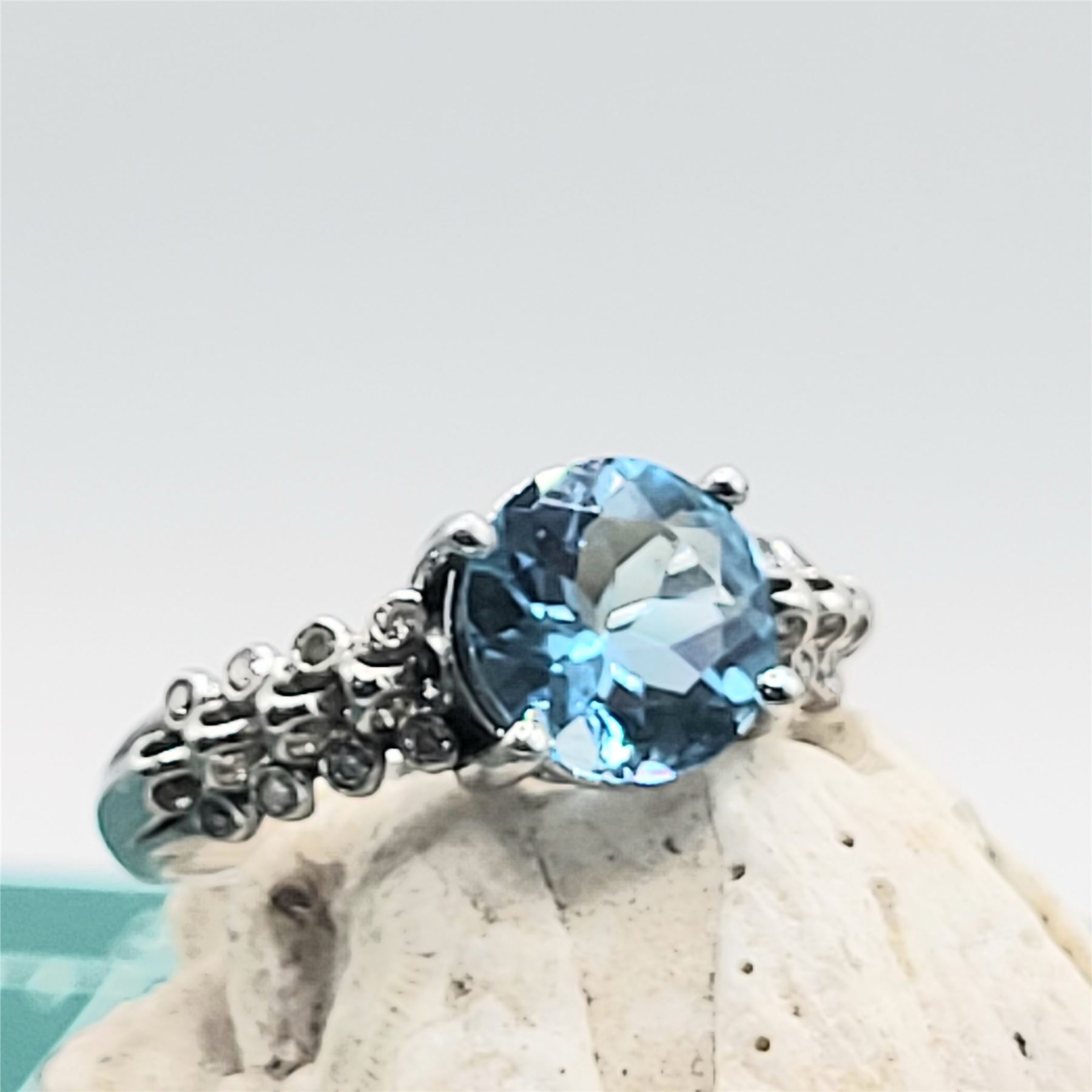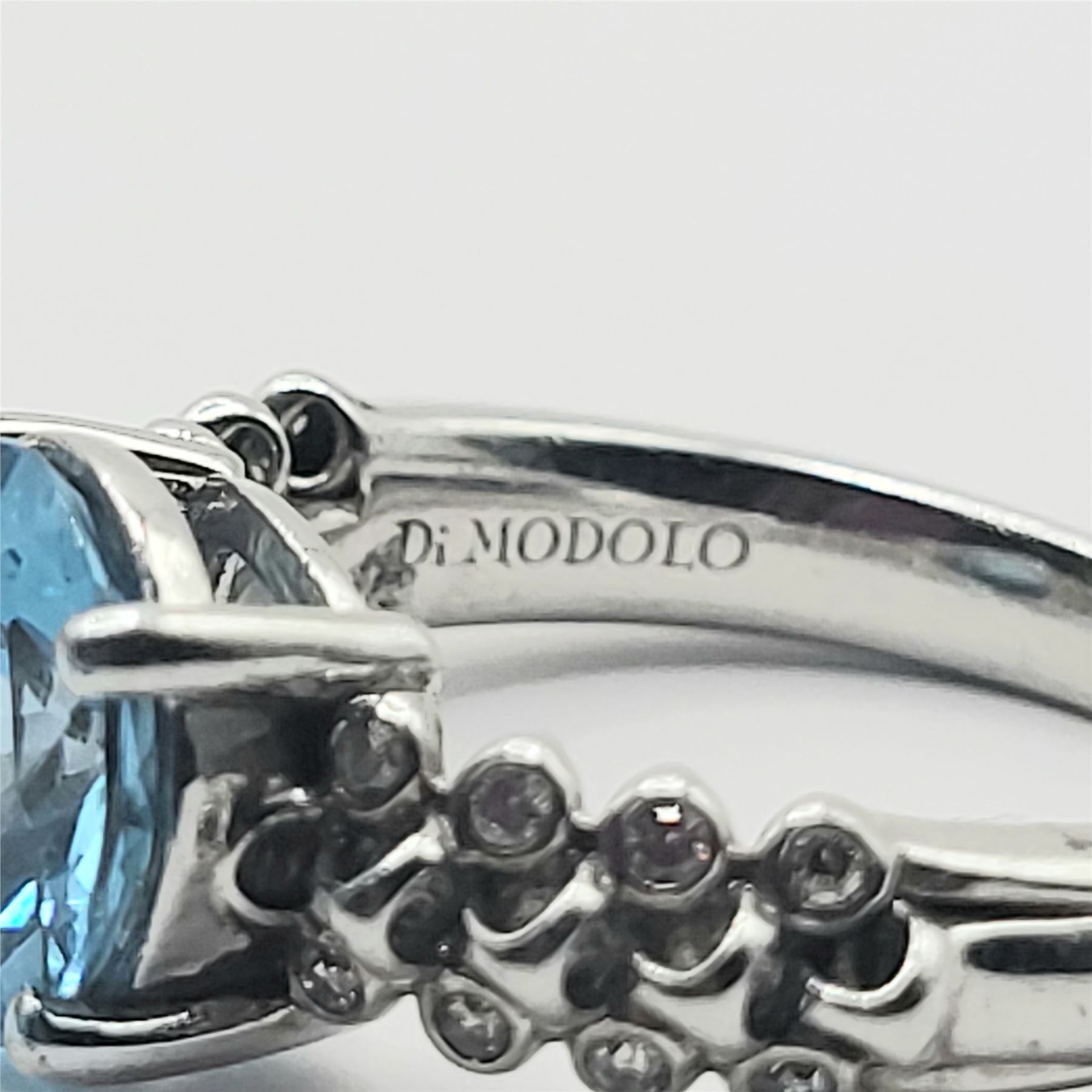 This sterling silver ring by Di Modolo, Italy, features an approximate 2.00 carat round, faceted, genuine Swiss blue topaz and .16 carats total weight round, brilliant-cut, H color, SI2 clarity diamonds that are bezel-set on the shoulders. The shoulders are further adorned with sterling silver beads between the diamonds. The shoulders taper to an approximate 2.80mm comfort-fit shank. This ring is US size 6.25 and can be sized for an additional charge. Rest assured, the master jeweler Bidfair Fine Jewelry partners with for sizing will NOT destroy the hallmark that is stamped inside the shank. Admin: 33122/8g