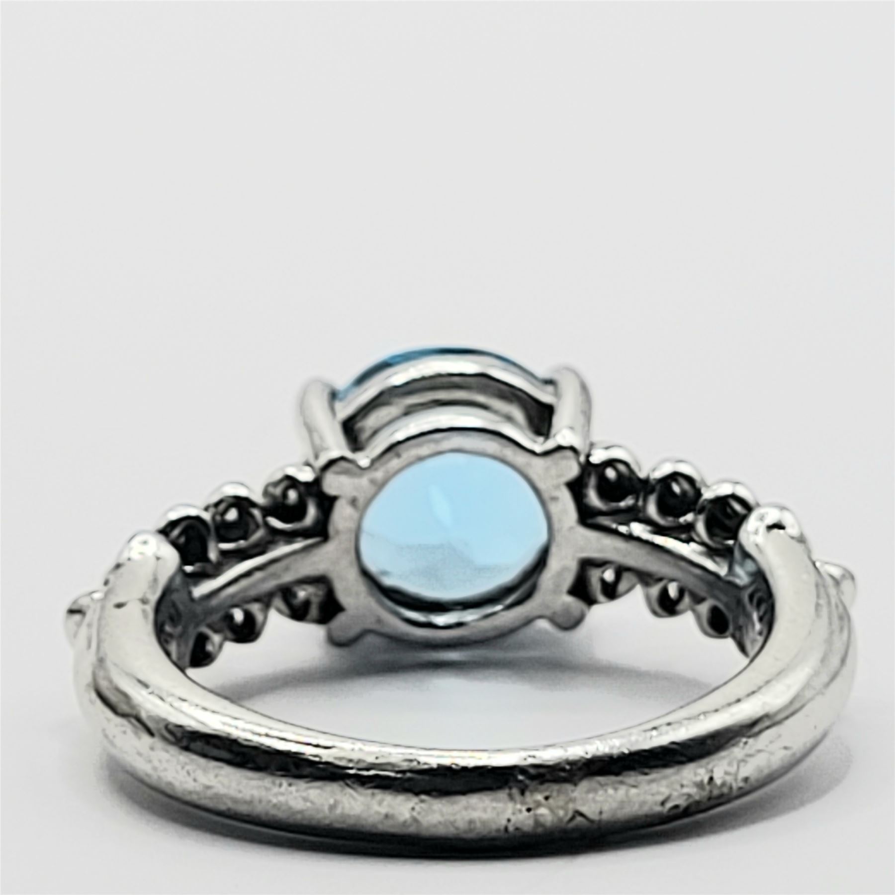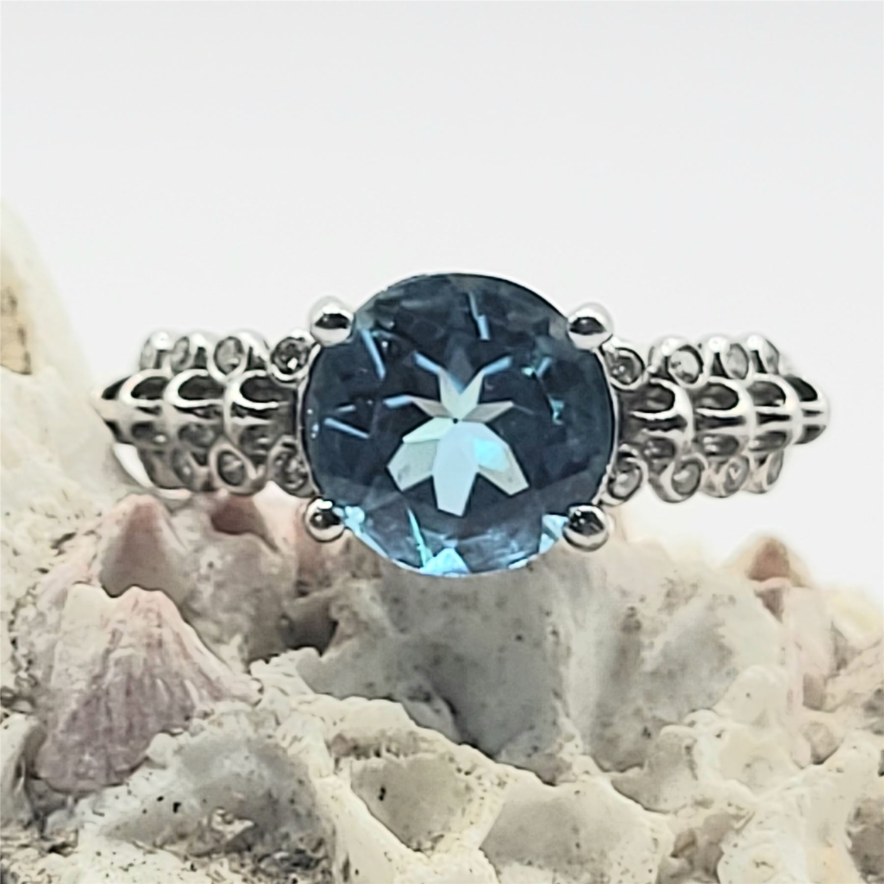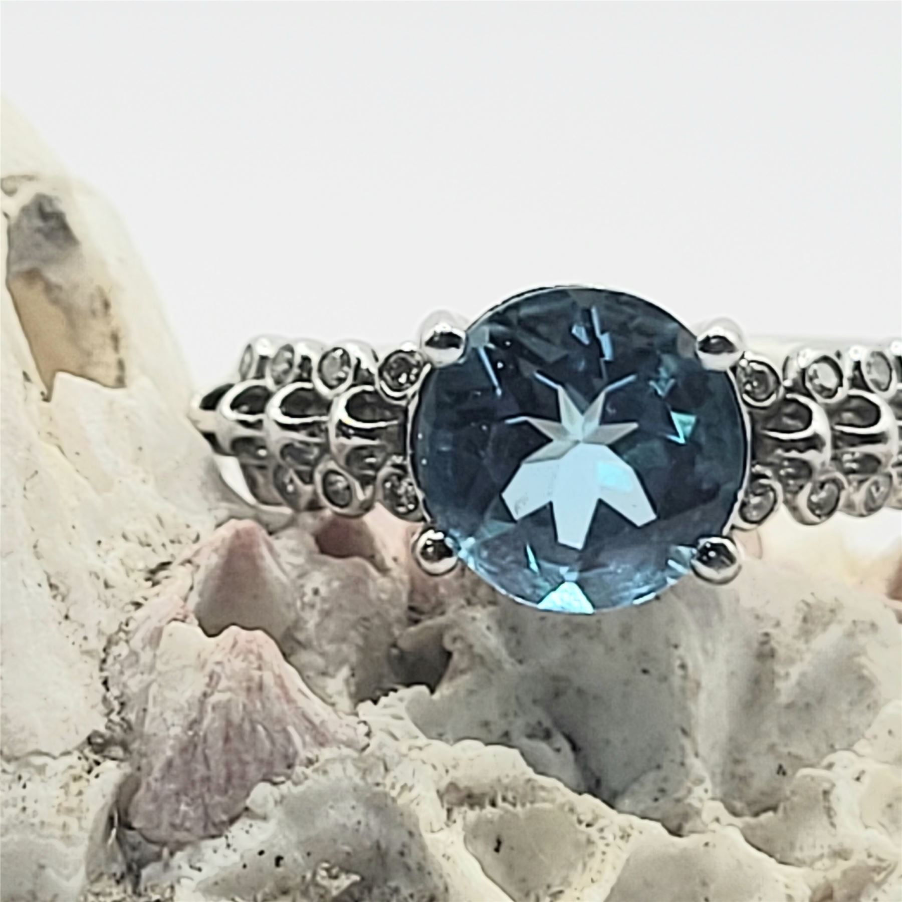 This sterling silver ring by Di Modolo, Italy, features an approximate 2.00 carat round, faceted, genuine Swiss blue topaz and .16 carats total weight round, brilliant-cut, H color, SI2 clarity diamonds that are bezel-set on the shoulders. The shoulders are further adorned with sterling silver beads between the diamonds. The shoulders taper to an approximate 2.80mm comfort-fit shank. This ring is US size 6.25 and can be sized for an additional charge. Rest assured, the master jeweler Bidfair Fine Jewelry partners with for sizing will NOT destroy the hallmark that is stamped inside the shank. Admin: 33122/8g