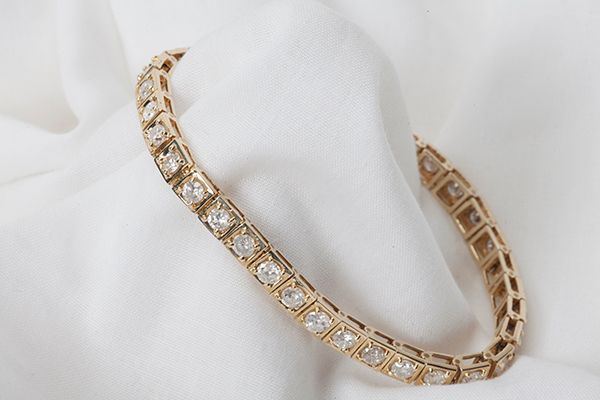 Diamond, 14k Yellow Gold Tennis Style Bracelet. Featuring 34 round full cut diamonds, weighing a total of approximately 6.00 carats, 7 inches in length, gross weight 18.00 grams.