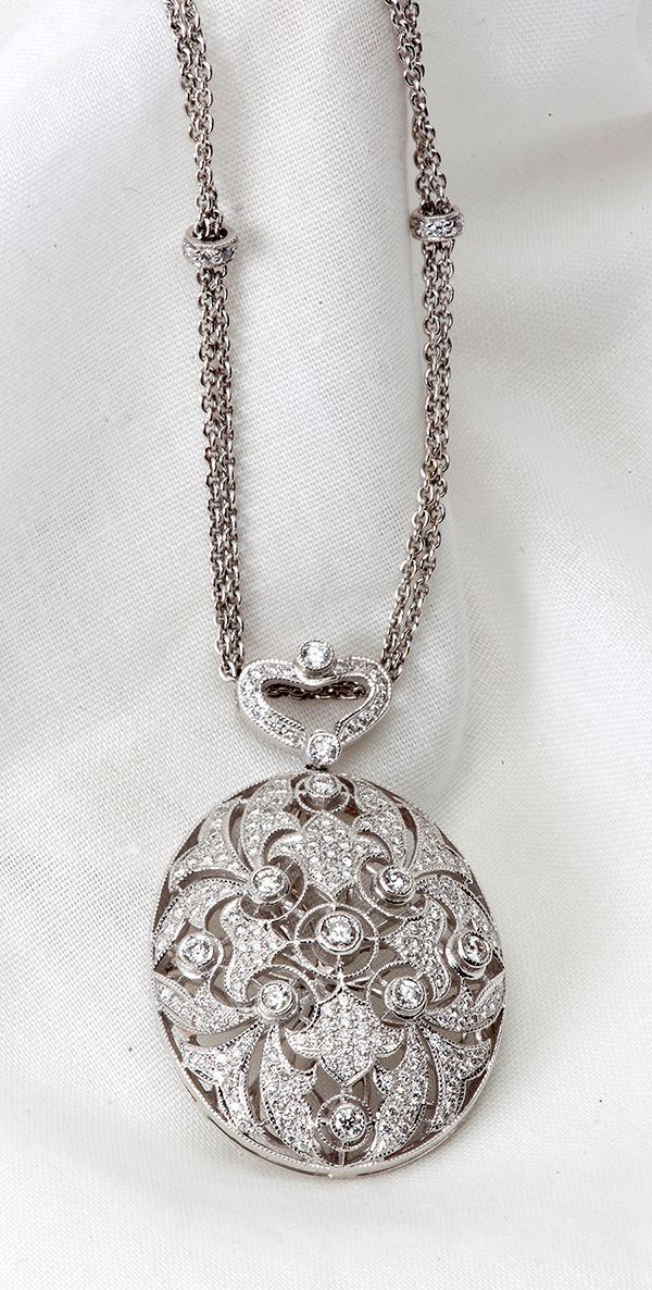 Diamond, 18k White Gold Pendant/Necklace. The oval pendant is decorated by round full cut diamonds, open and scroll work with milgrained edges, along with a heart shaped bail and connected to a double row link style chain, with 2 diamond rondells, measuring 16 inches in length, the diamonds weigh a total of approximately 1.70 carats, gross weight 17.70 grams.
