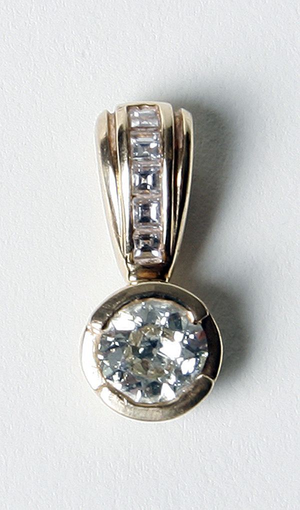 Diamond, 18k Yellow Gold Pendant. Featuring one European cut diamond, weighing approximately .90 carat, 1/2 bezel set, decorated on the bail by 5 square cut diamonds, weighing a total of approximately .30 carat, channel set, gross weight 3.00 grams.