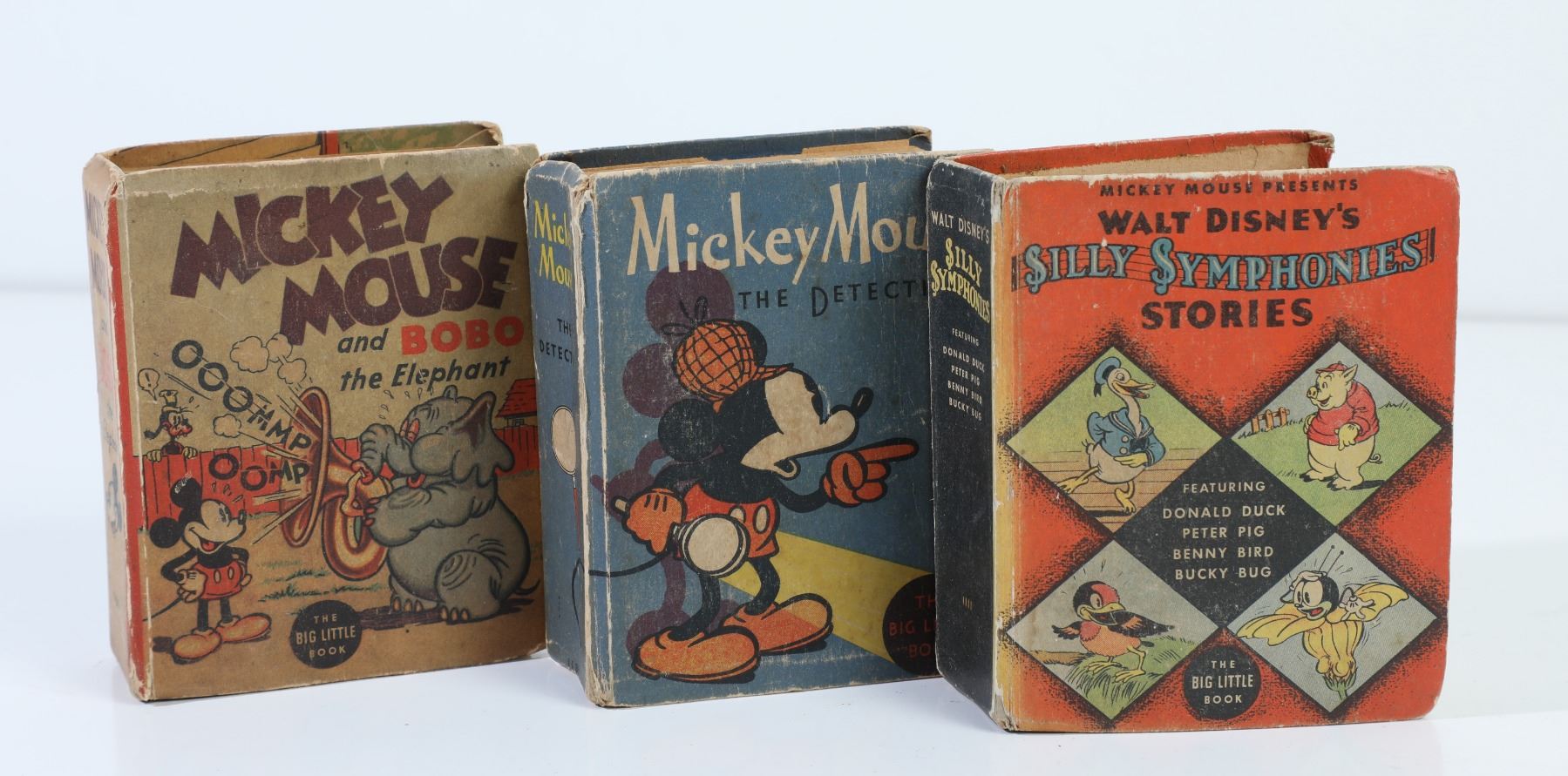 (Disney, 1934, 1935 & 1936). Three rare and early Walt Disney's "big little books" for "Mickey Mouse and Bobo the Elephant", "Mickey Mouse the Detective", and "Silly Symphonies Stories featuring Donald Duck, Peter Pig, Benny Bird and Bucky Bug." The books are in fair condition with normal wear from age and use.