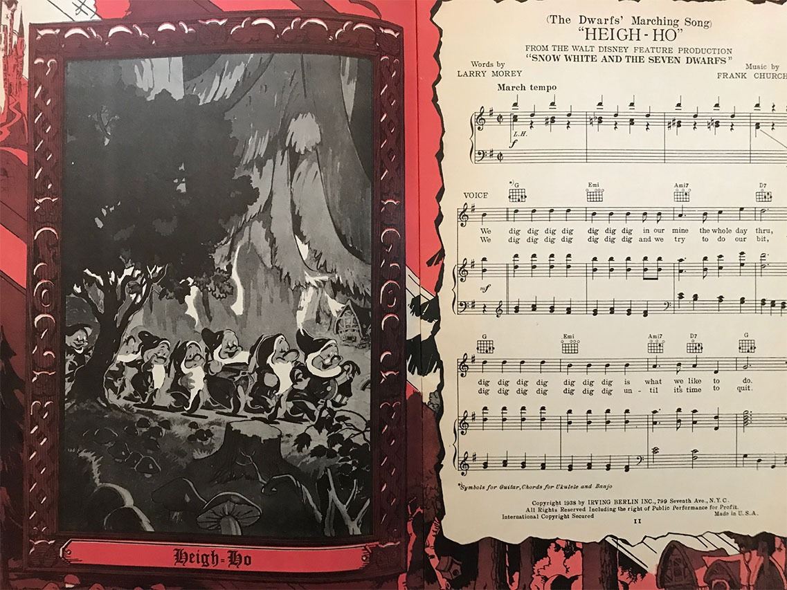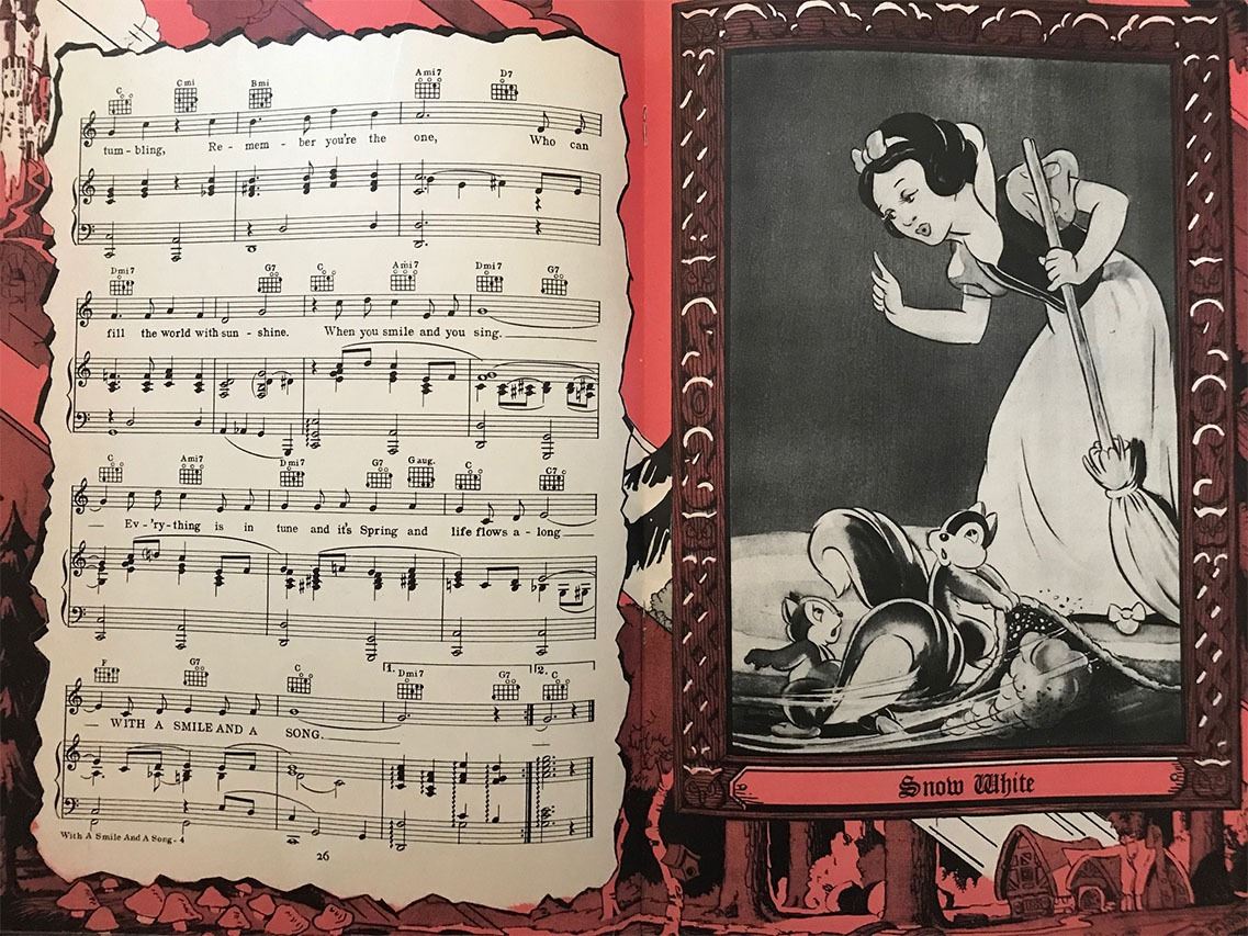 (Disney, c. 1938). Souvenir sheet music for Walt Disney's "Snow White and the Seven Dwarfs" from 1938 the features nine songs from the animated film and 14 illustrations. The sheet music measures approximately 12" x 9" and is in good condition with normal wear from age and handling. Item comes with a Grand Circle Tour Auctions COA.