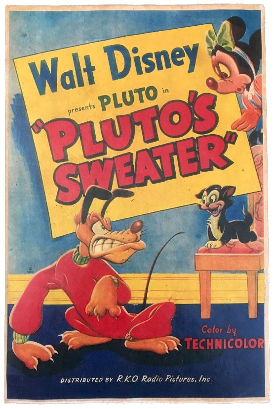 (Disney, c. 1950's-90's). A rare, vintage poster of Disney's "Pluto's Sweater", a 1949 animated short film with Pluto, Minnie Mouse and Figaro the kitten. The film follows the story of an ugly sweater that Minnie is knitting for Pluto and the teasing he receives from Figaro for wearing it. The film is the final appearance of Figaro in theater released animation by Disney. The poster is in good condition with normal wear from age and use including some spotting on the backside of the poster, fading and rippling of the poster, edge wear, and a tear at the top portion of the poster. The poster measures approximately 16.5" x 11". Item comes with a Grand Circle Tour Auctions COA.
