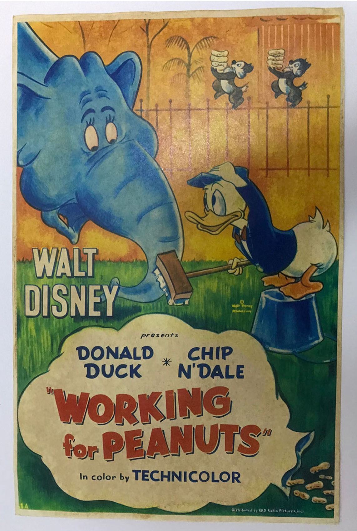 (Disney, c. 1950's). A rare, vintage poster of Disney's "Working for Peanuts", a 1953 animated short film with Donald Duck and Chip 'N Dale. It is one of the first Disney shorts filmed in 3D and was marketed as such with the tagline "Walt Disney's Donald Duck & Chip 'N Dale in their first laugh riot in 3-Dimension." The story follows that of Donald working at a zoo while enduring the antics of Chip 'N Dale. The poster is in good condition with normal wear from age and use including some spotting on the backside of the poster, fading and rippling of the poster, and edge wear. The poster measures approximately 16.5" x 11".