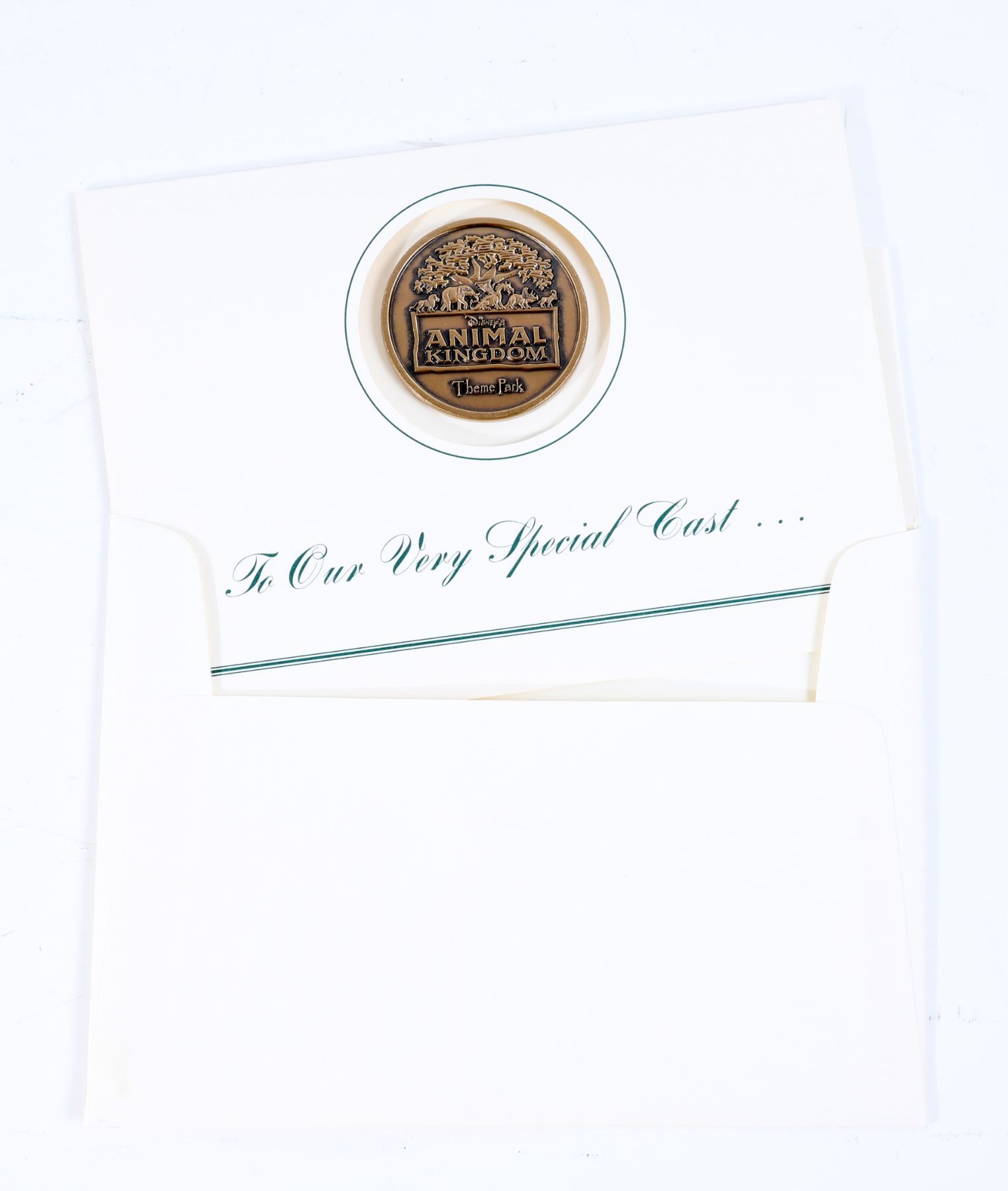 (Walt Disney World, Animal Kingdom, c. 1998). A Disney Animal Kingdom cast member exclusive grand opening coin. The coin displays the "Tree of Life" and "Disney's Animal Kingdom" and is still housed in its original holder. The holder reads "To Our Very Special Cast..." The coin and holder are in good condition with normal wear from age and minimal handling. Item comes with a Grand Circle Tour Auctions COA.