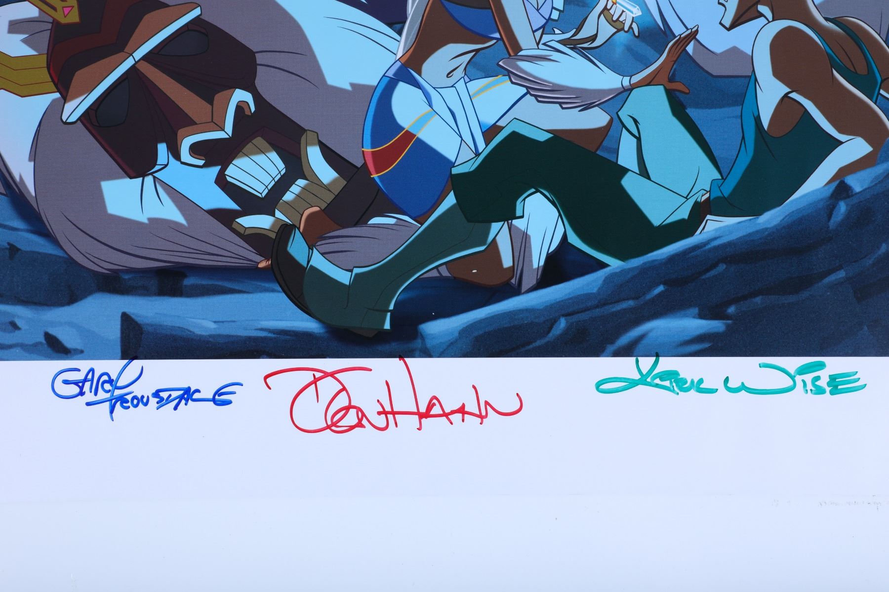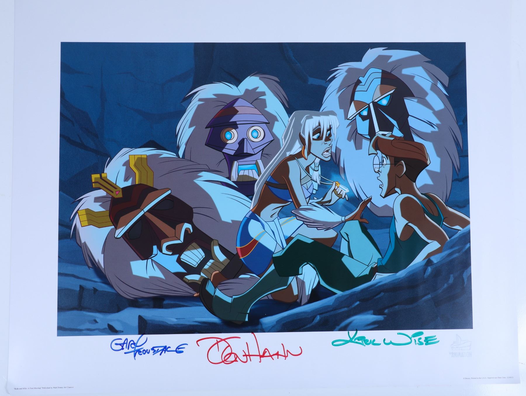 (Disneyland, Disney Gallery, c.1998). A very rare Disneyland Disney Gallery Atlantis The Lost Empire "Kida and Milo: A First Meeting" limited edition of 500 lithograph signed by Producer Don Hahn and Directors Kirk Wise & Gary Trousdale. The lithograph is in good condition with normal wear from age and minimal handling. Item comes with a Grand Circle Tour Auctions COA.