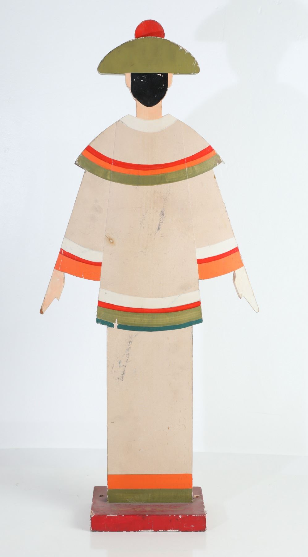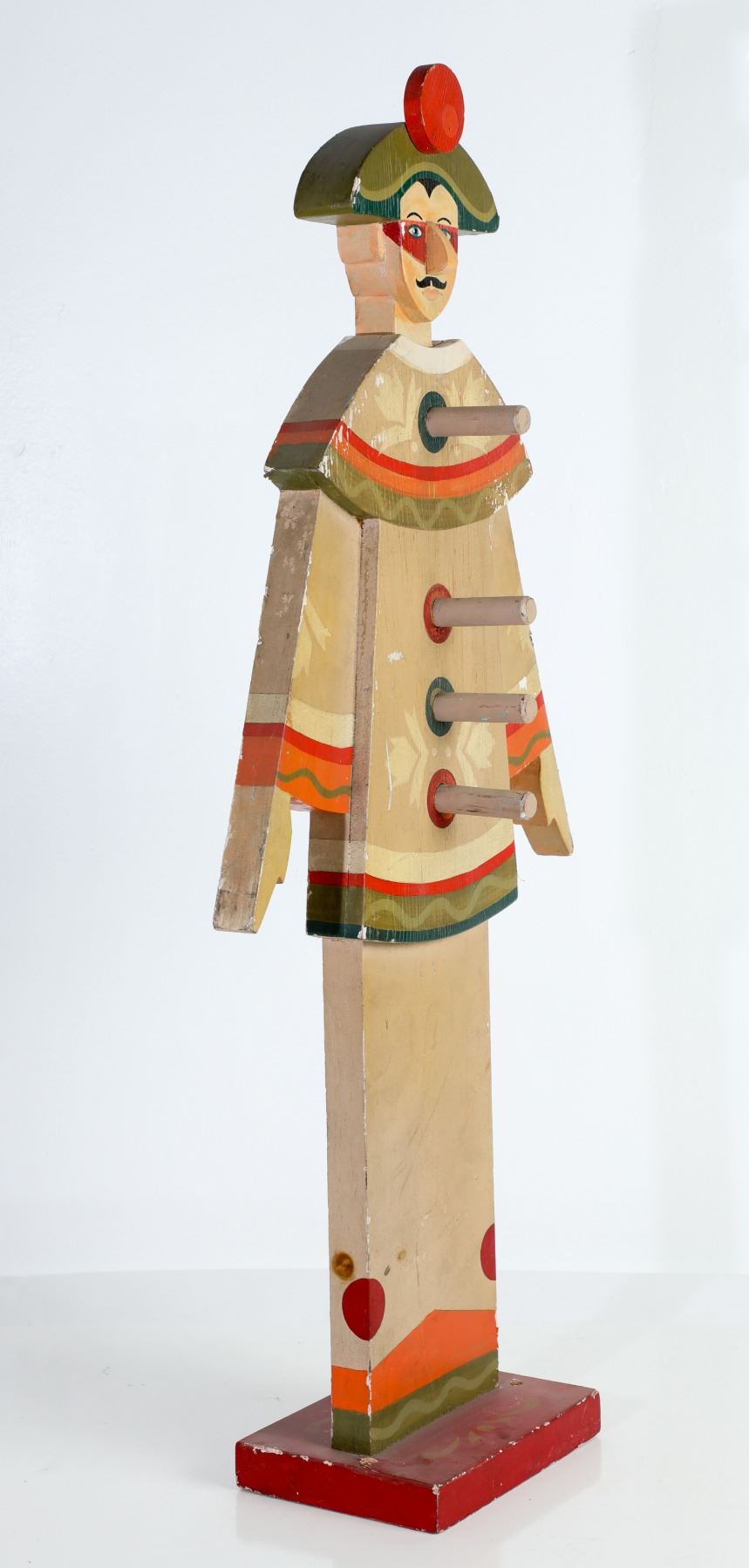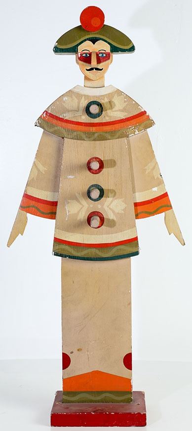 (Disney California Adventure, c. 2000's). A Disneyland California Adventure park used clown board prop display. The board presents four pegs for the game of tossing rings onto a peg to win a prize. The board itself is designed as a vintage carnival performer in clown costume. The board is in good condition with normal wear from age and park use. Measures approximately 34 1/2" x 14". Item comes with a Grand Circle Tour Auctions COA.