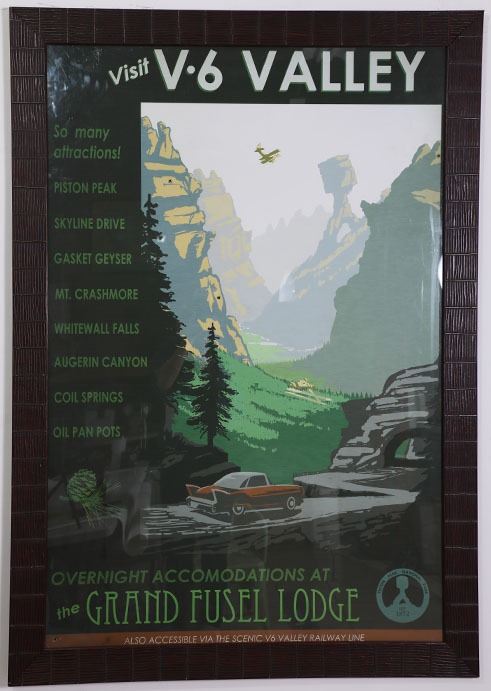 (Disney, El Capitan Theatre, Cars Premiere, c. 2005). Disney Pixar "Cars" premiered on June 9, 2006 at Hollywood's legendary El Capitan Theatre. On view at the premiere was this beautiful poster titled "Visit V6 Valley" and displaying several Cars characters. A very rare and historical poster for one of Disney Pixar's most successful film franchises. In 2012, Disney California Adventure opened "Cars Land" where this same style of poster was put on display. The poster is in good condition with normal wear from age and theater use, including small anchoring holes that were used to keep the poster in secured. These holes go through the actual image of the poster but are small in detail. The item measures approximately 58" x 40.5".