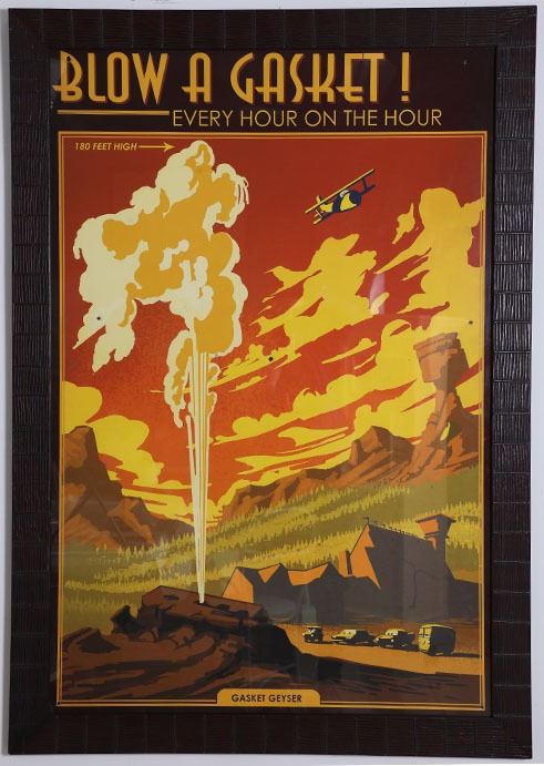 (Disney, El Capitan Theatre, Cars Premiere, c. 2005). Disney Pixar "Cars" premiered on June 9, 2006 at Hollywood's legendary El Capitan Theatre. On view at the premiere was this beautiful poster titled "Blow a Gasket!" and displaying several Cars characters. A very rare and historical poster for one of Disney Pixar's most successful film franchises. In 2012, Disney California Adventure opened "Cars Land" where this same style of poster was put on display. The poster is in good condition with normal wear from age and theater use, including small anchoring holes that were used to keep the poster in secured. These holes go through the actual image of the poster but are small in detail. The item measures approximately 58" x 40.5".
