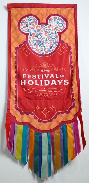 (Disney California Adventure, c. 2019-20). A park used prop banner made for Disney California Adventure's "Festival of Holidays". The banner is in very good condition with normal wear from age and use in the park.