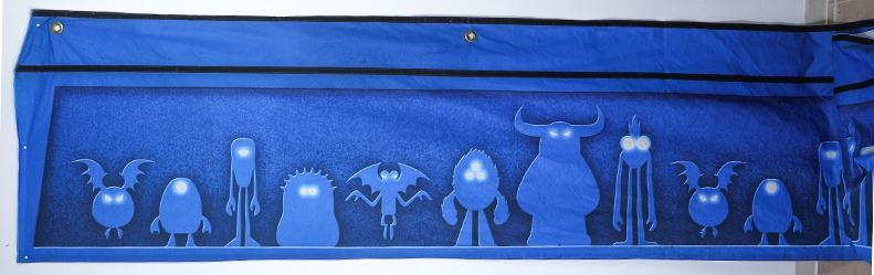 (Disney California Adventure, c. 2000's). A rare Disney California Adventure park used prop banner displayed during Halloween time and themed to "Monsters University." The banner measures approximately 190" x 36.5" and is in good condition with normal wear from age and park use.