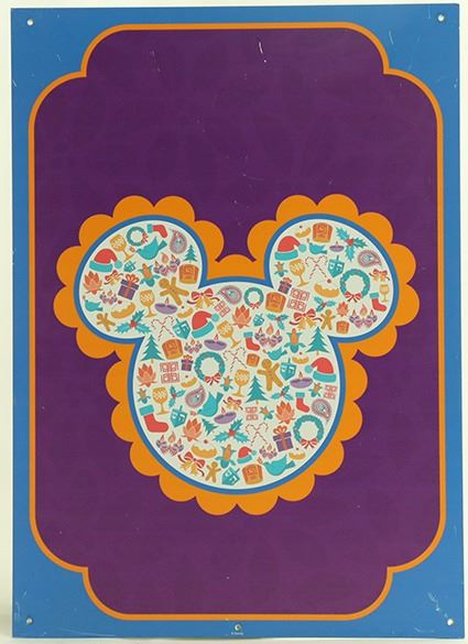 (Disneyland, c. 2000's). A Disney California Adventure holiday park used prop sign with a classic Mickey Mouse image with blue and purple background. The sign is in good condition with normal wear from age and park use.