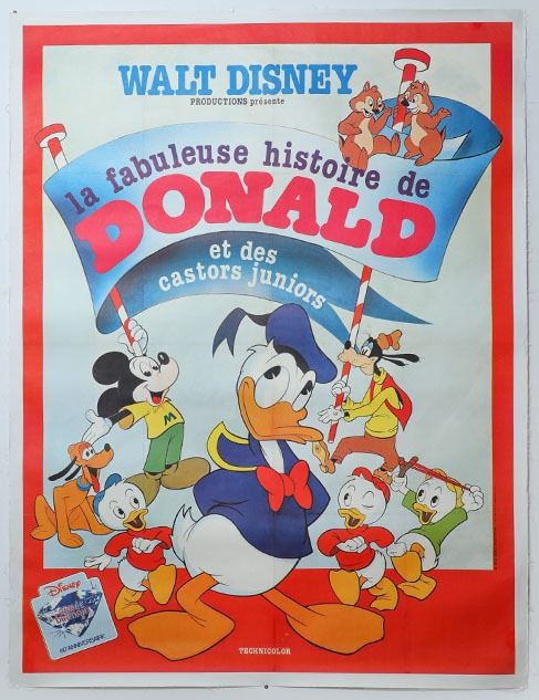 (Disney, c. 1983). A rare Walt Disney Company 60th anniversary poster "la fabuleuse histoire de Donald et des castors juniors" featuring Donald Duck and his nephews Huey, Dewey and Louie. The poster is in good condition with normal wear from age and handling. The poster measures approximately 63" x 48" and has been professionally linen back for preservation and handling.