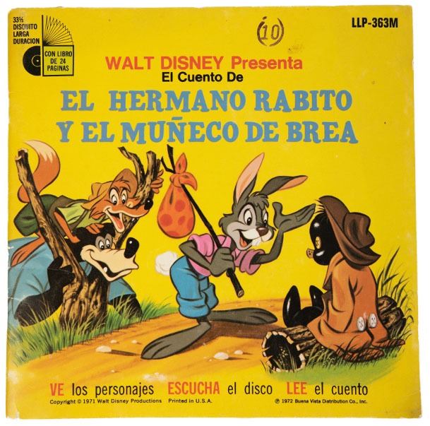 (Disney, c. 1973). A very rare Song of the South music album "El Hermano Rabito Y El Muñeco De Brea" album featuring characters of Br'er Rabbit, Br'er Fox and Br'er Bear. The album is in good working condition with normal wear from age and minimal use.