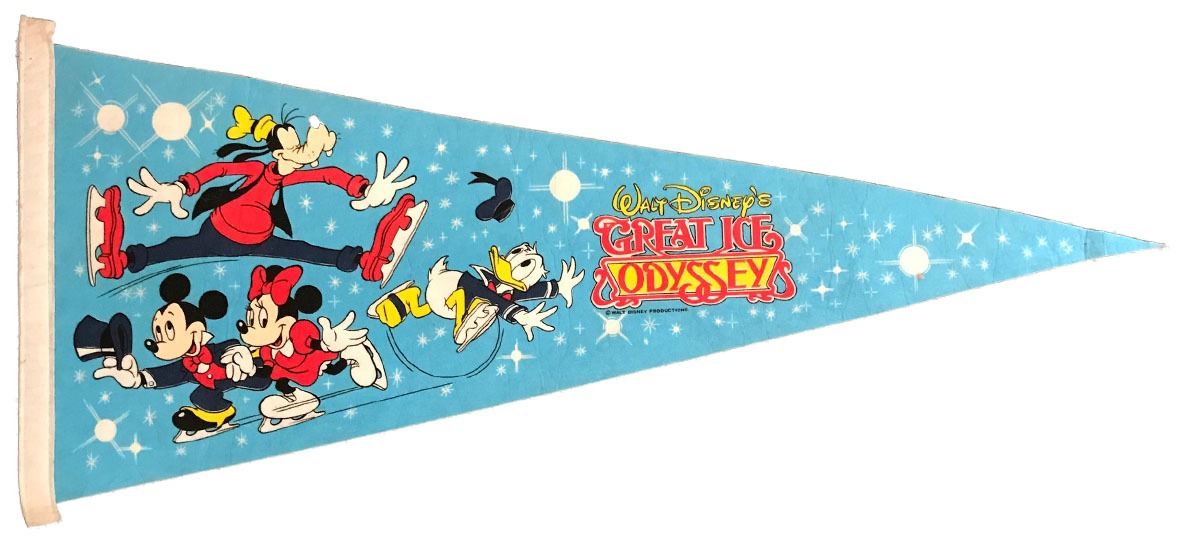 (Disney, c. 1982). A rare pennant from Disney's 1982 "Great Ice Odyssey" featuring classic Disney characters of Mickey Mouse, Minnie Mouse, Goofy and Donald Duck. The pennant is in good condition with normal wear from age and handling, including edge wear. Item comes with a Grand Circle Tour Auctions COA.