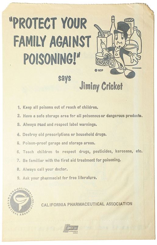 (Disney, c. 1976). A rare Disney Jiminy Cricket California ad, warning folks to "Protect Your Family Against Poisoning!". Western Communications, Ltd, ran this campaign as that month was "Poison Prevention March." A wonderful example of a Disney character being used for a public service announcement. The campaign has served as an example for future announcements like when the state of California borrowed Jiminy for 'Save Water' announcements. The ad is in good condition with normal wear from age and use, including edge wear.