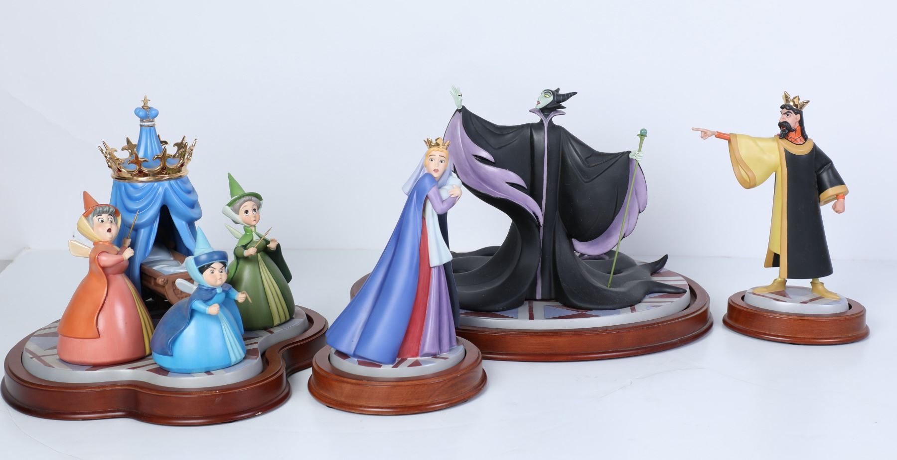 (Walt Disney Classics, c. 2004). Walt Disney's "Sleeping Beauty" was Disney's 16th full-length animated feature film, released in theaters in 1959. Walt knew how powerful and enchanting the story would be and in great foresight named the castle in Disneyland "Sleeping Beauty Castle" in 1955. It has since been one of the most beloved of all Disney films and continues to resonate with audiences, including recent and upcoming Maleficent movies. Offered here is a rare 45th limited edition series "Sleeping Beauty" scene with multiple, expertly crafted, figurines of the characters of Aurora, Maleficent, King Stefan, Queen Leah, Flora, Fauna and Merryweather. The figurines could only be purchased as a lot and not individually when they were released to the general public in 2004. The figurines are in very good condition with normal wear from age and minimal handling.
