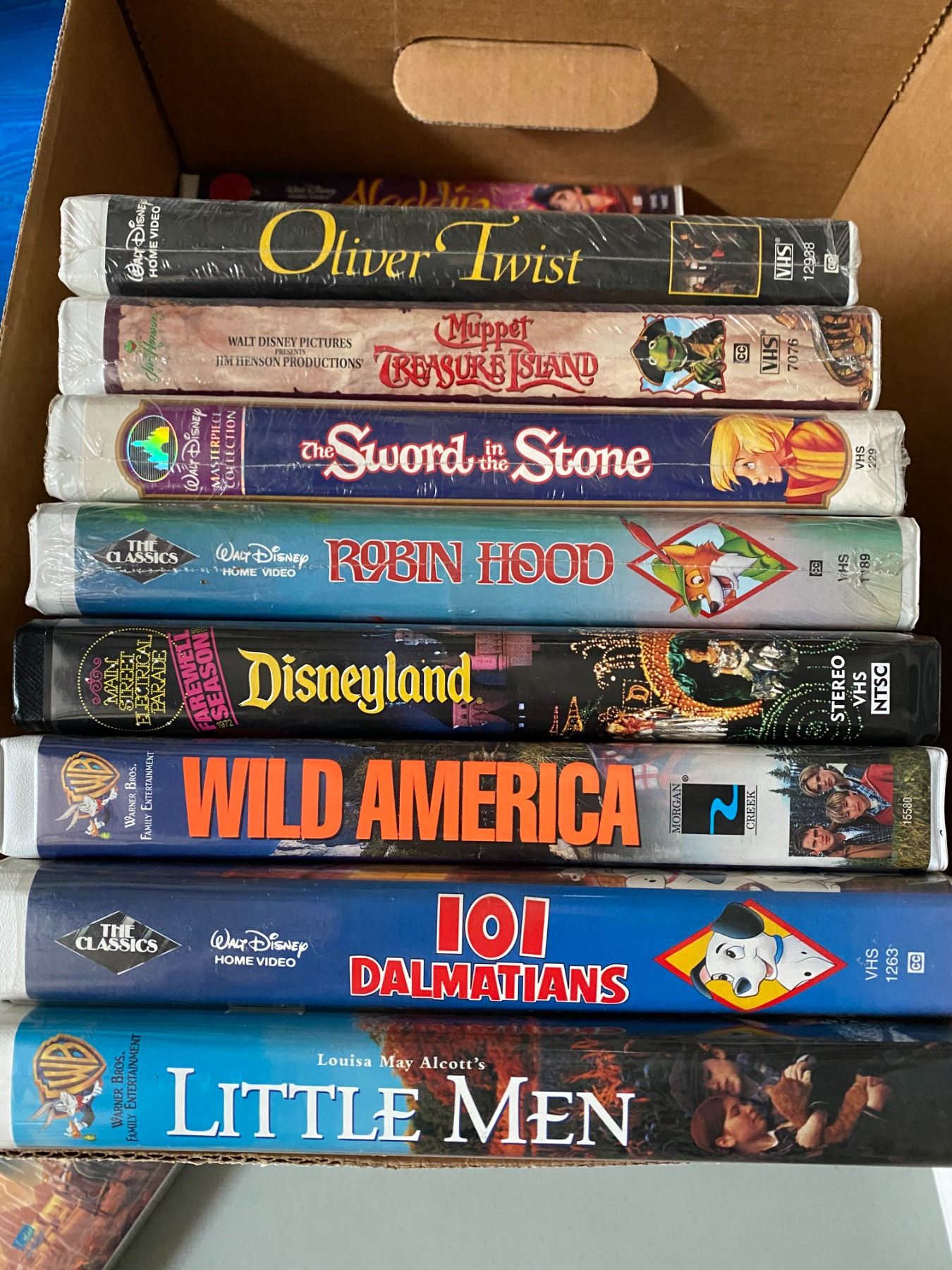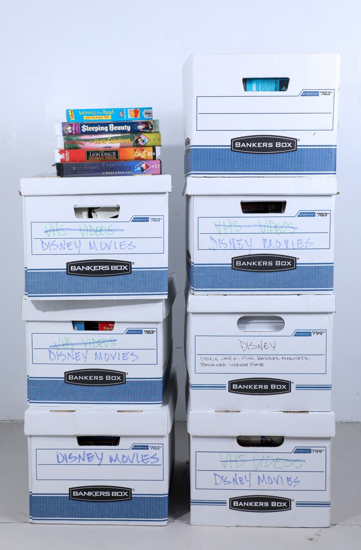 (Disney, c. 1940's-2010's). A large lot of 7 boxes of classic Disney movies and films. The lot includes VHS and DVD format and for several Disney classics like "Fantasia", "Sleeping Beauty" and more. The lot also includes rare films like Disney's "True Life Adventures." There are also several family-friendly non-Disney films like "The Land Before Time" and "Rise of the Guardians." A total of 192 VHS movie, 11 DVDs, etc. Item comes with a Grand Circle Tour Auctions COA.