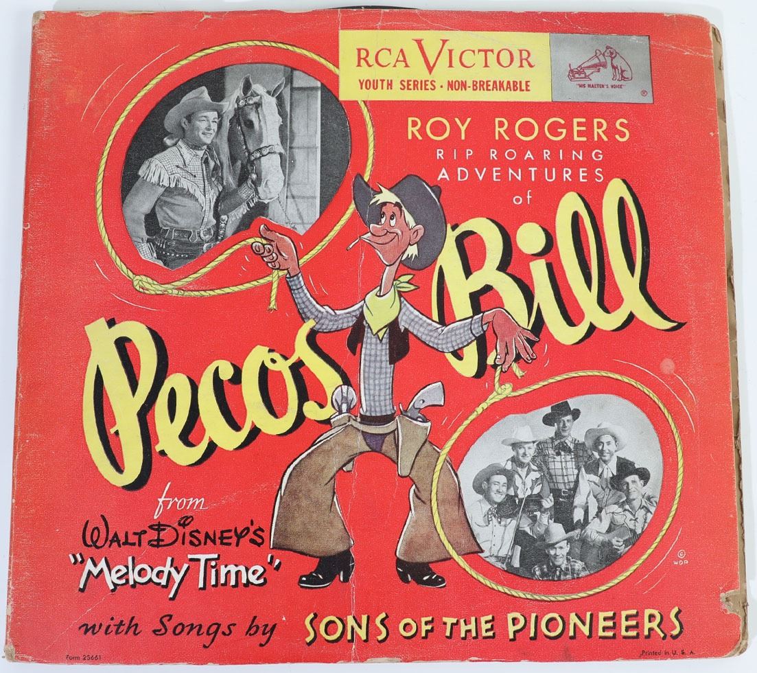 (Disney, c. 1949). Walt Disney's "Melody Time" was released to theaters in 1948 and included the story of "Pecos Bill". Listed here is an original "Pecos Bill" music album. The album is in good working condition with normal wear from age and use.