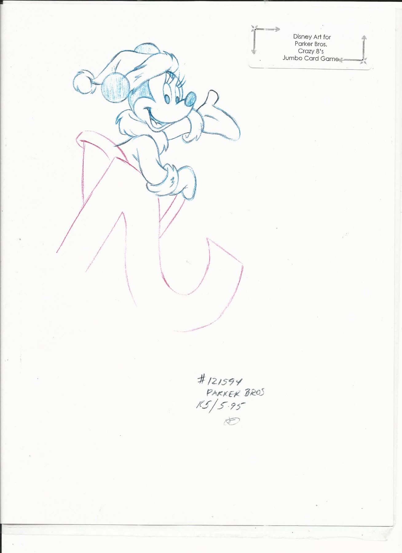 Disney Minnie Mouse original hand drawn vintage art for Parker Bros. Hasbro Crazy 8's Jumbo Card Game. 8.5 x 11 inches