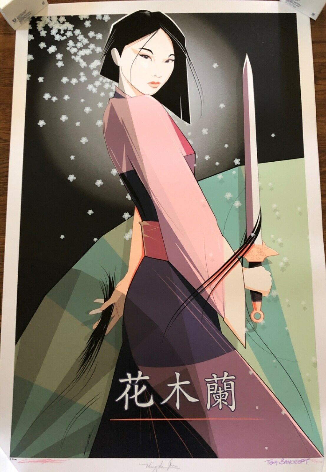 (Disney, c. 2019). Disney's animated feature film "Mulan" was released in theaters in 1998. A live action film version was released by Disney in 2020. Offered here is a rare limited edition, of only 43 produced, Mulan poster signed by Artist Craig Drake, Ming-Na Wen, the voice of Mulan, and Tony Bancroft, the director of Mulan. The poster has dimensions approximately of 36" x 24" and is in very good condition with normal wear from age and minimal handling.