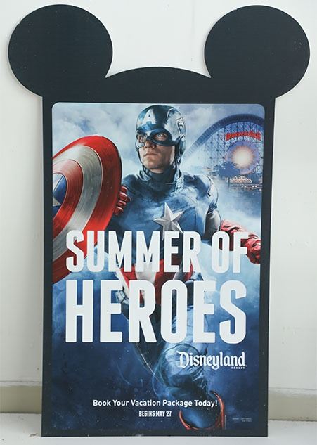 (Disney Parks, c. 2000's). A Disneyland prop sign featuring Marvel's Captain America. The sign is in good condition with normal wear from age and park use.