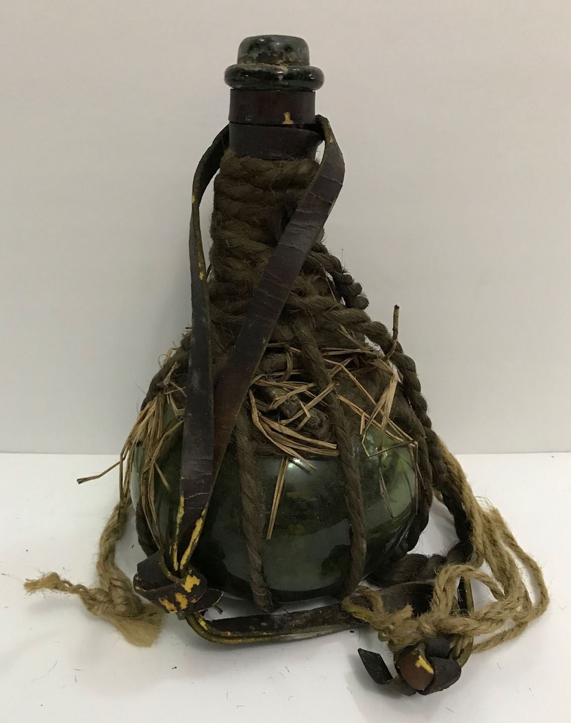 (Disney, c. 2003). Disney released "Pirates of the Caribbean: The Curse of the Black Pearl" in 2003 and started one of the most successful Disney film franchises and the most successful one based on a Disneyland attraction. With five movies completed and another one in production, the rum jokes will never end. Offered here is a movie production used bottle or "rum bottle" from the first Pirates of the Caribbean film. The bottle is darkly colored and expertly dressed in prop leather, straw and rope that appears distressed and aged. A leather strap is included on the bottle to aid in the act of holding around the body. There is a cork firmly placed at the top of the bottle but only appears when looking directly on top of the bottle. This was most likely placed in the bottle to protect the mouth of actors when pretending to drink directly from the bottle. The bottle is in very good production condition.